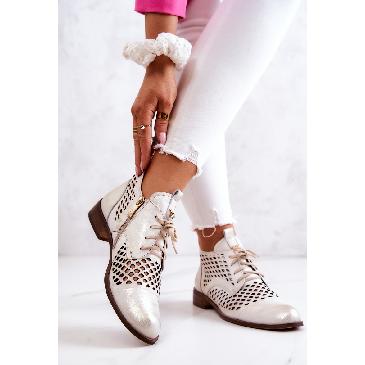 Tutustu Nicole 2704/004 harjakattoisten nilkkurien viehätysvoimaan hillittynä valkoisena versiona, jossa on elegantteja kultaisia aksentteja. Nämä ainutlaatuiset kengät, jotka on valmistettu korkealaatuisesta luonnonnahasta, yhdistävät tyylin ja mukavuuden, joten niistä tulee varmasti vaatekaappisi avainelementti.