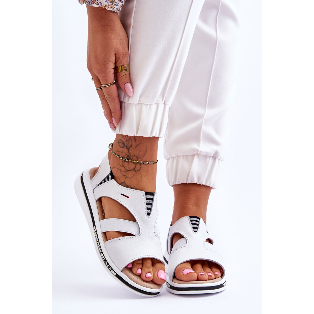Klassinen valkoinen ja mustia lisäyksityiskohtia lisäävät sandaalit sopivat helposti mihin tahansa kesätyyliin - ilmavista mekoista rentoihin farkkuihin. Minimalisminsa ja eleganssinsa ansiosta ne ovat täydellinen valinta jokaiselle naiselle, joka arvostaa universaalisuutta ja tyylikkyyttä.