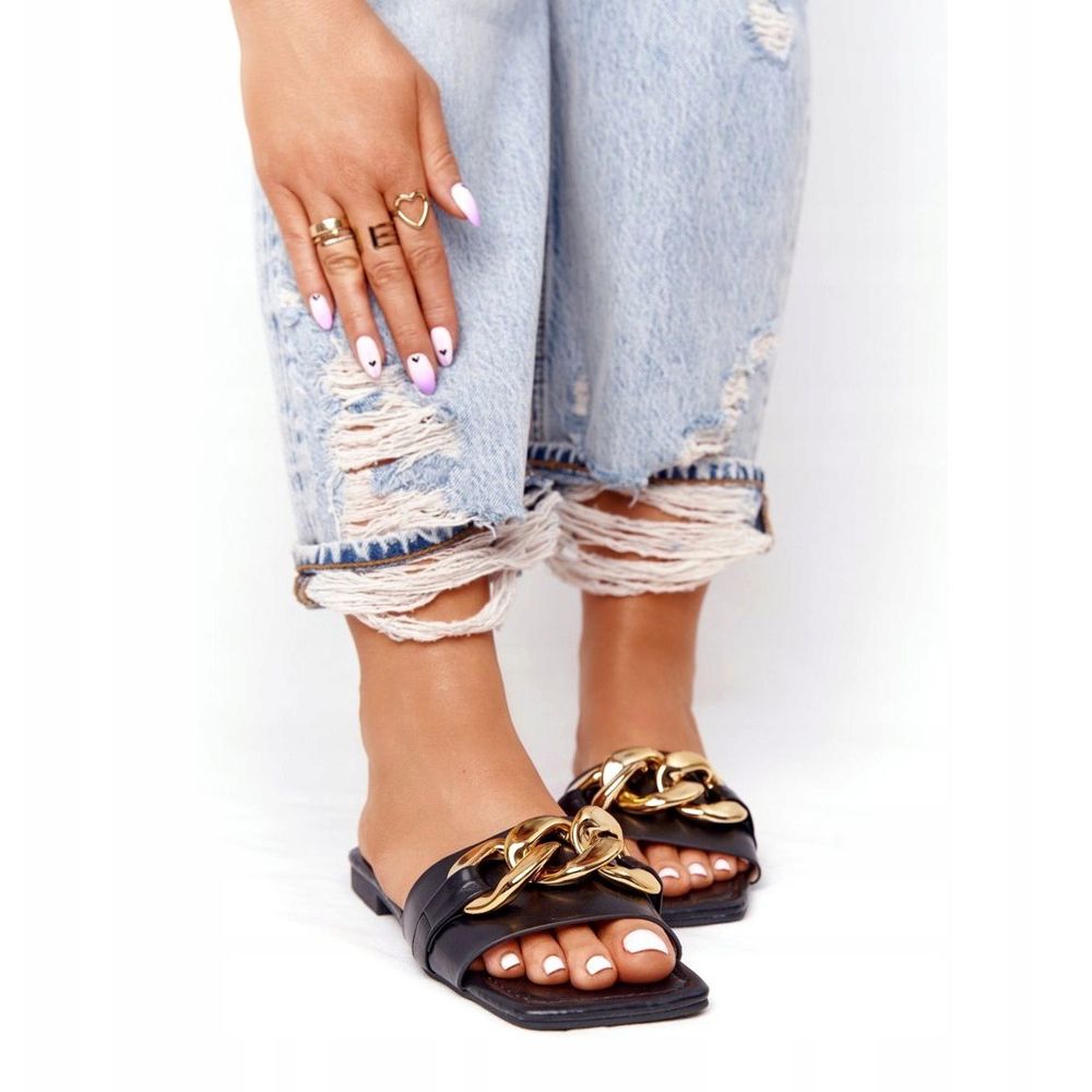 Nahkaiset varvastossut ketjulla Black French Kiss ovat ihanteellinen tarjous naisille, jotka arvostavat sekä muodikasta muotoilua että mukavuutta. Elegantilla kultaketjulla koristeltuissa liukumäissä on nelikulmainen kärki, joka on yksi tämän kauden kuumimmista trendeistä.