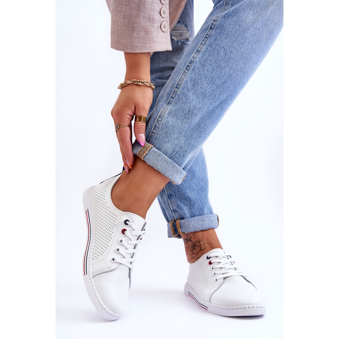 Kevyt, tyylikäs ja ilmava ehdotus lämpimämpiä päiviä varten - matalat ferone -lenkkarit, jotka on valmistettu luonnollisesta nahasta. Yläosa tarjoaa erinomaisen ilmanvaihdon, ja luonnon nahkainen pehmeä mukavuusasetus takaa mukavuuden koko päivän. Malli on asetettu 2 cm: n alustalle, jolla on kumi, ei -liukupohja. Koristeellisella langalla olevat nauhat lisäävät hienovaraisen merkin, ja klassinen valkoinen väri voi helposti vastata päivittäisiä tyyliä.