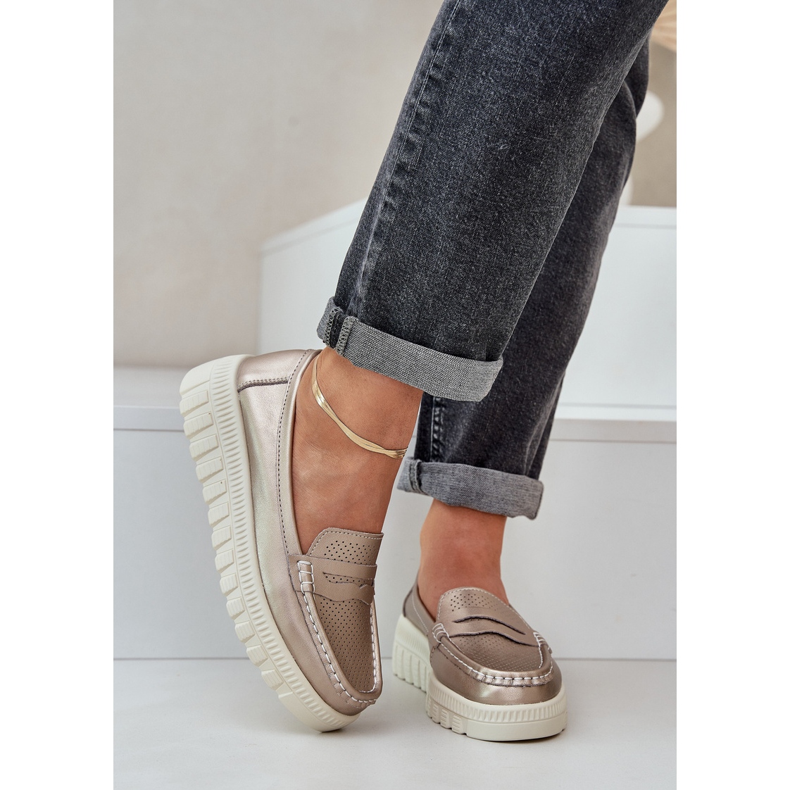 Esitämme lavalla ja samppanja -nahkaisten naisten nahkaleimurit - kultaiset kiilat, jotka ovat ihanteellinen yhdistelmä tyylikkyyttä ja mukavuutta. Korkealaatuisesta luonnollisesta nahasta valmistettu leveys on klassinen tyyli, joka sopii täydellisesti kevään kesän suuntauksiin.