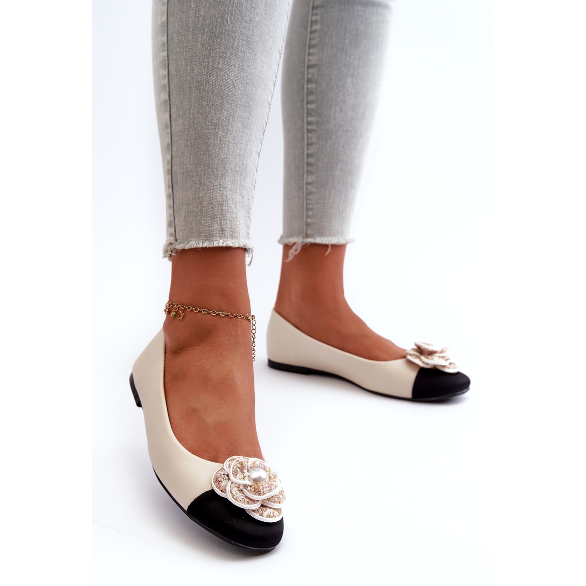 Edessä balleriinit on koristeltu viehättävällä kukilla, joka antaa heille luonteen ja hienovaraisen eleganssin. Litteä kantapää, jonka korkeus on 0,8 cm, tekee tästä mallista erittäin mukavan ja pyöristetyt nenät varmistavat liikkumisen vapauden ja mukavuuden, jota arvostat kaikkien päiväpäivän kuluessa.