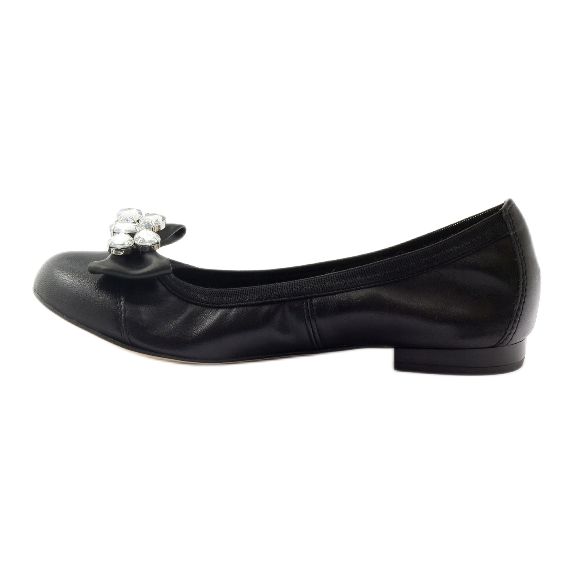 Tyylikkäät naisten balerinakengät Gamis malli. 1402 - klassinen hienovarainen kiilto. Valmistettu korkealaatuisesta luonnonnahasta, yleismustan värisenä, koristeellisella rusetilla nastoitettu kristalleilla, jotka lisäävät tyyliä ja säilyttävät hienovaraisen eleganssin. Malli, jossa on herkkä kantapää (n. 1,5 cm), sopii niin arkeen kuin juhlavampaankin käyttöön. Helma istuu mukavasti jalkaan, ja pehmeällä sienellä vuorattu nahkapohjallinen takaa mukavuuden koko päivän. Slip-on balettitassut pyöreällä varpaalla - ajaton tyyli uusimmasta kevät-kesämallistosta.