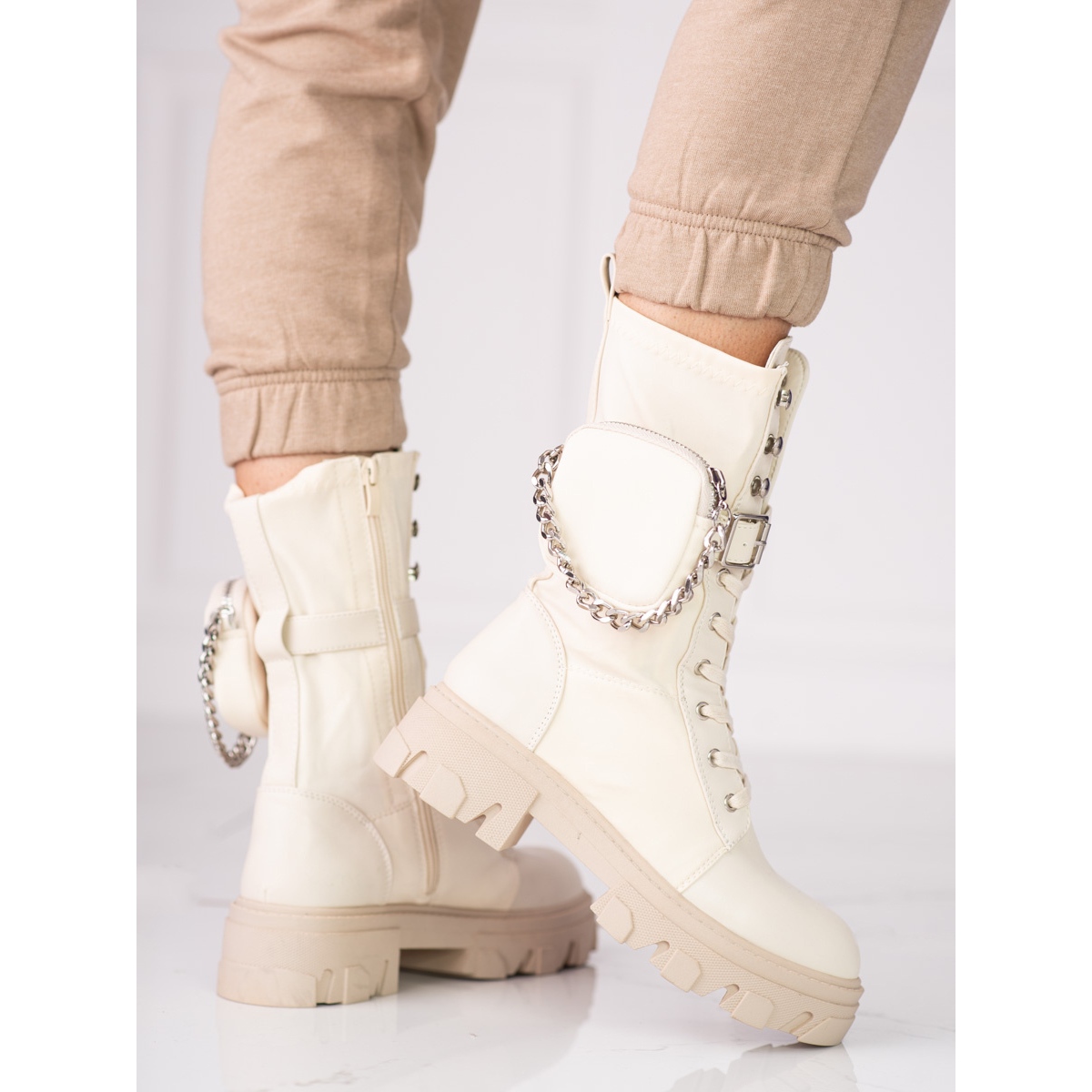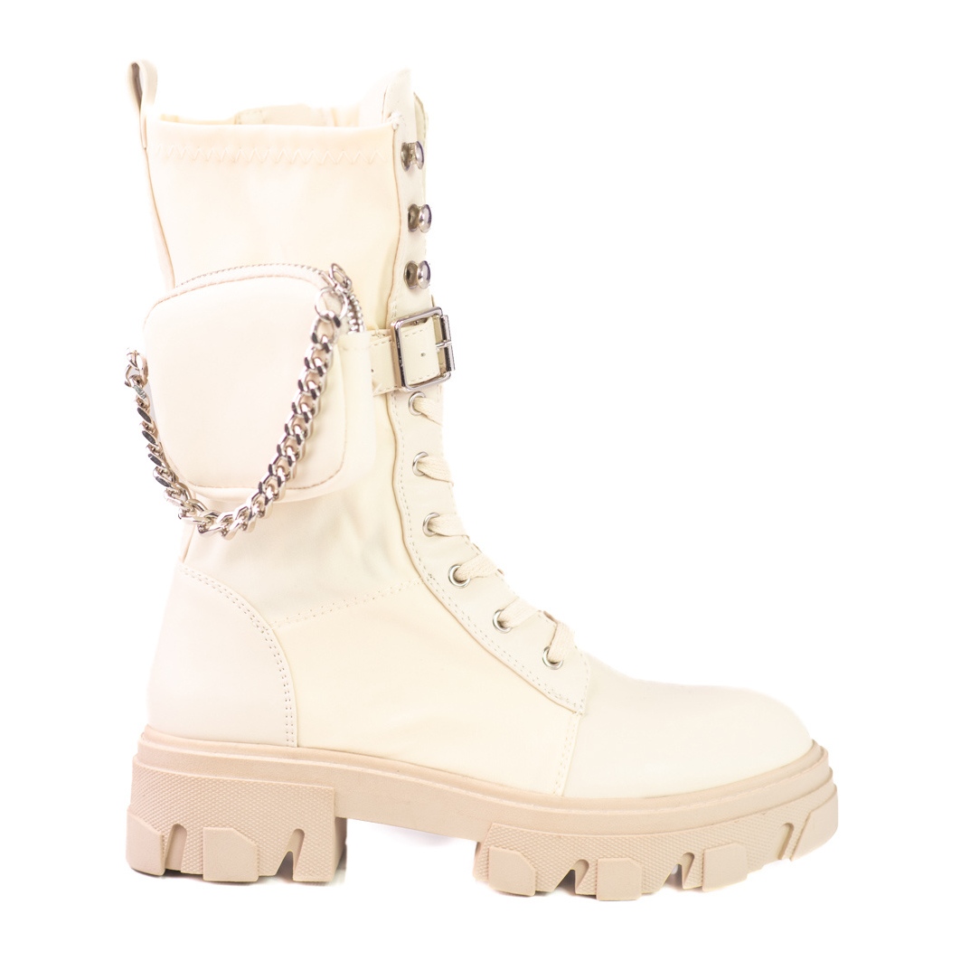 Beigen värin ja minimalistisen muotoilun ansiosta nämä nilkkurit sopivat täydellisesti erilaisiin tyyleihin - arkisesta tyylikkäämpään. Vetoketju-, solki- ja nauhoituskiinnitys mahdollistavat täydellisen istuvuuden jalkaan, ja lisäelementti ketjun muodossa antaa niille alkuperäisen luonteen.