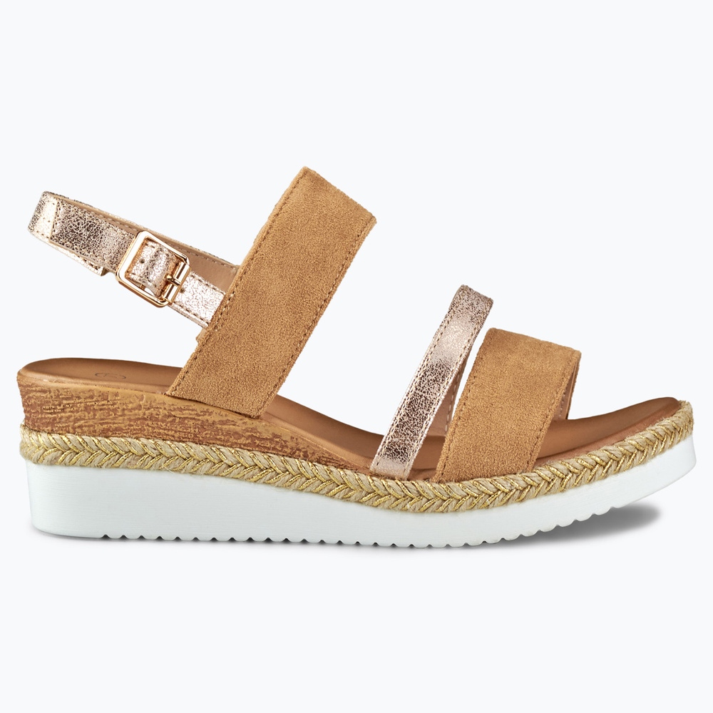 Ympäristöystävällisestä mokkanahkasta valmistetut sandaalit eivät ainoastaan tarjoa tyylikkään ilmeen, vaan myös ympäristöystävällisen valinnan. Avoimet varpaat lisäävät keveyttä, ja metalliset kullanväriset aksentit tekevät sandaaleista huomiota herättäviä ja lisäävät kiiltoa mihin tahansa tyyliin.