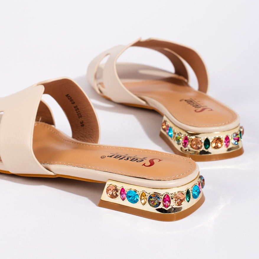 Tälle mallille on ominaista liukuva kiinnitys ja avoin kantapää, mikä tekee niiden asettamisesta ja ottamisesta nopeasti ja yksinkertaisesti. Kestävästä muovista valmistettu sileä pohja varmistaa vakauden ja mukavuuden kävellessä. Lisäksi hienovaraiset strassit antavat läpät tyylikkään aksentin, mikä tekee niistä täydellisesti sulautumaan sekä päivittäisiin tyyliöihin että tyylikkäimpiin asuihin.