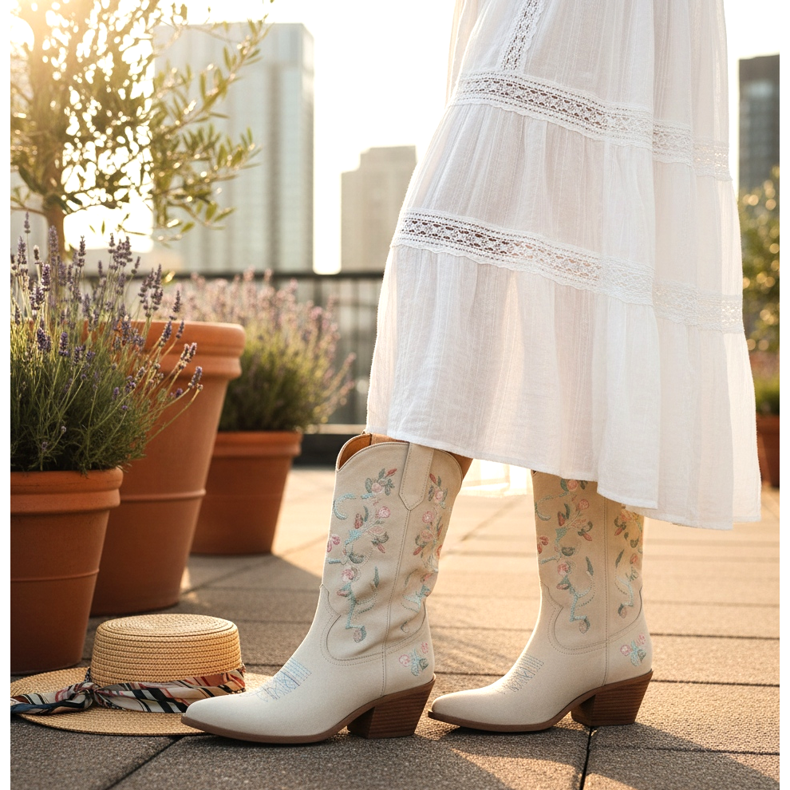 Tällä kaudella paitsi klassinen ruskea ja musta ovat muodissa. Valitse valkoiset, hopeiset tai värikkäät brodeeratut cowboysaappaat. Tällaisista kengistä tulee muotoilun pääelementti, joten säilytä muut asut hillityissä väreissä. Valkoiset cowboysaappaat ovat hitti kesäjuhlissa!