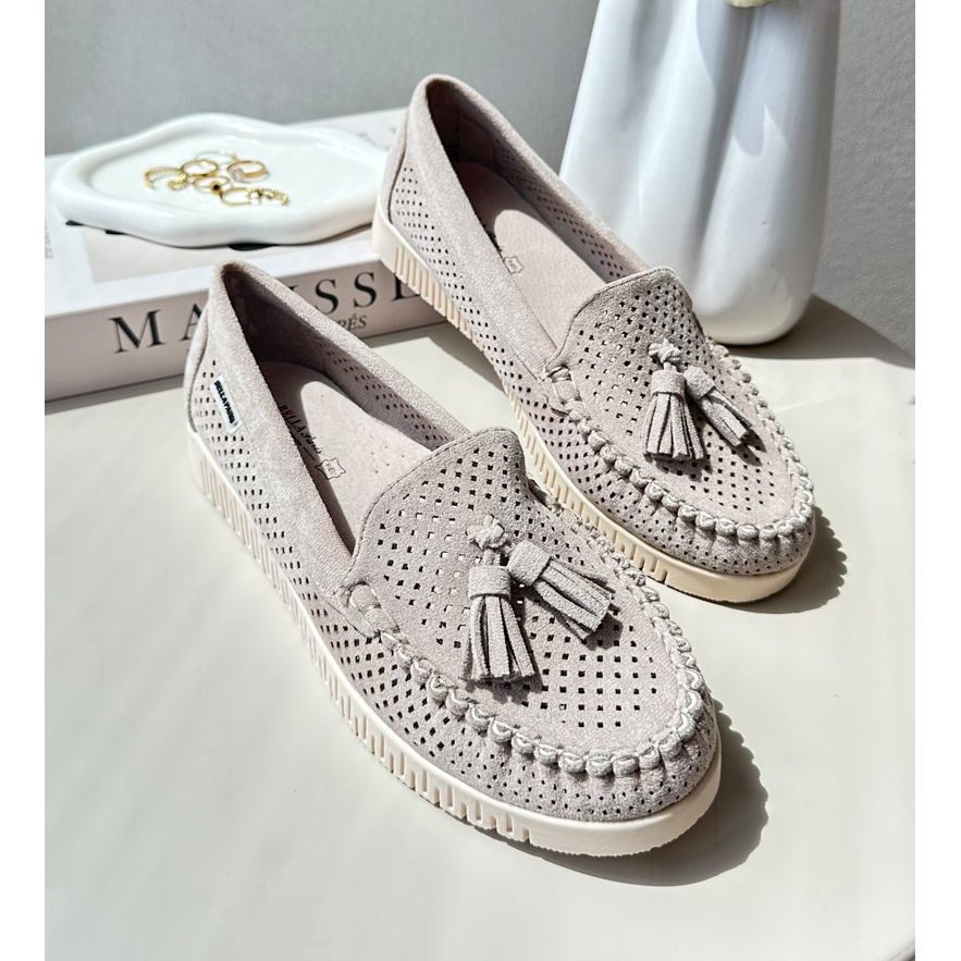 Tutustu ainutlaatuiseen tyyliin ja mukavuuteen avoimien naisten mokkasiinien kanssa, joissa on eko mokkanahka -tölkejä tyylikkäässä beige -sävyssä. Nämä 2 cm: n korkealle alustalle asetetut muodikkaat kengät ovat yhdistelmä klassikoita ja nykyaikaisuutta. Pyöristetyt nenät ja koristeelliset reunat edessä antavat heille tyylikkään hahmon, joka on ihanteellinen sekä rentoille että tyylikkäimmille tyylille.