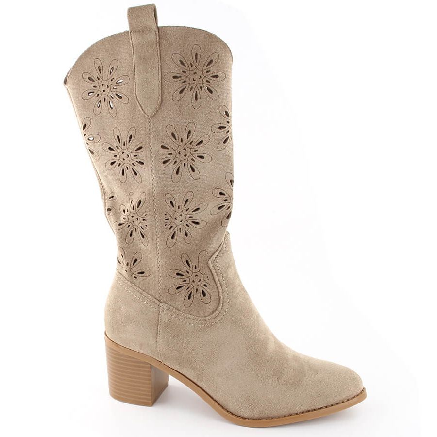 Saappaat valmistettiin korkealaatuisesta ekologisesta nahasta mokkanahassa, mikä tarjoaa heille sekä esteettisen ulkonäön että kestävyyden. Avoin työsuunnittelu antaa heille keveyden ja omaperäisyyden, mikä vastaa täydellisesti kevät-kesän auraa. Noin 27 cm - puoleen vasikan yläosan korkeus saa jalat näyttämään ohuilta, ja mantelin varpa lisää hienovaraisuutta ja naisellisuutta.