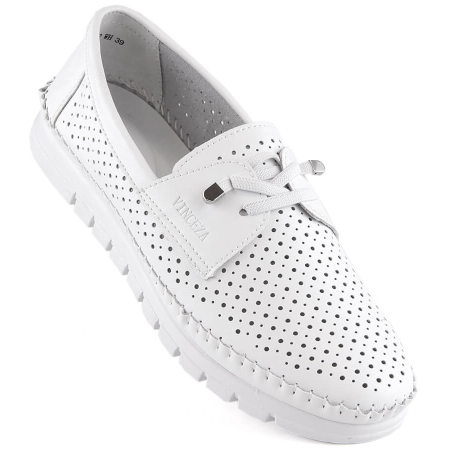Valkoiset Vinceza-kengät ovat malli, joka toimii hyvin sekä keväällä että kesällä tarjoten hengittävyyttä ja käyttömukavuutta. Slip-on-kiinnityksen ansiosta niiden pukeminen ei vaadi vaivaa, ja pyöreä nenä lisää niihin viehätystä. Luonnollinen nahkavuori ja pohjallinen takaavat käyttömukavuuden koko päivän, ja 2,5 cm:n pohjan paksuus takaa vakauden ja riittävän tuen jaloille.