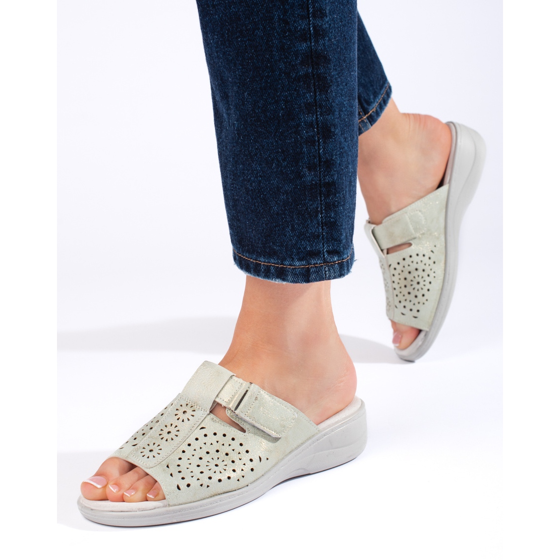 Näiden valmistajan flip -flopsit erottuvat kauniista avoimesta kuviosta, joka antaa heille keveyden ja omaperäisyyden. Valmistettu korkealaatuisesta ekologisesta nahasta, sekä ulkopuolelta että sisältä, tarjoavat täydellisen istuvuuden ja mukavuuden käyttää koko päivän. Pehmeä ekologinen nahkainen insertti huolehtii jalkojen mukavuudesta, ja avoin kantapää on helpompaa laittaa ja poistaa kenkiä.