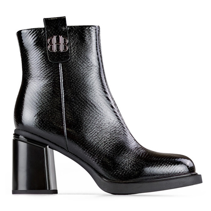 Saappaat ovat pyöristetty nenä ja 13 cm korkea yläosa, jotka ulottuvat nilkan yli, mikä korostaa niiden tyylikkäitä luonnetta. Musta, lakattu viimeistely herkällä eläinkuviolla antaa heille ainutlaatuisen tyylin, ja turkiseristys suojaa jalat kylmiltä, mikä tarjoaa mukavuutta.