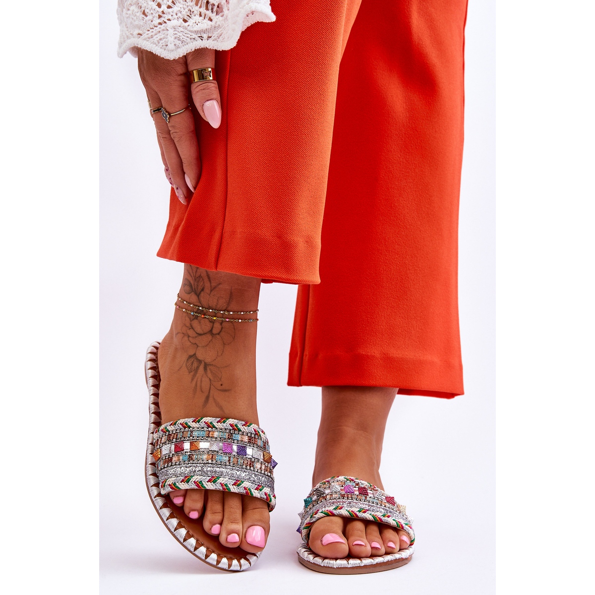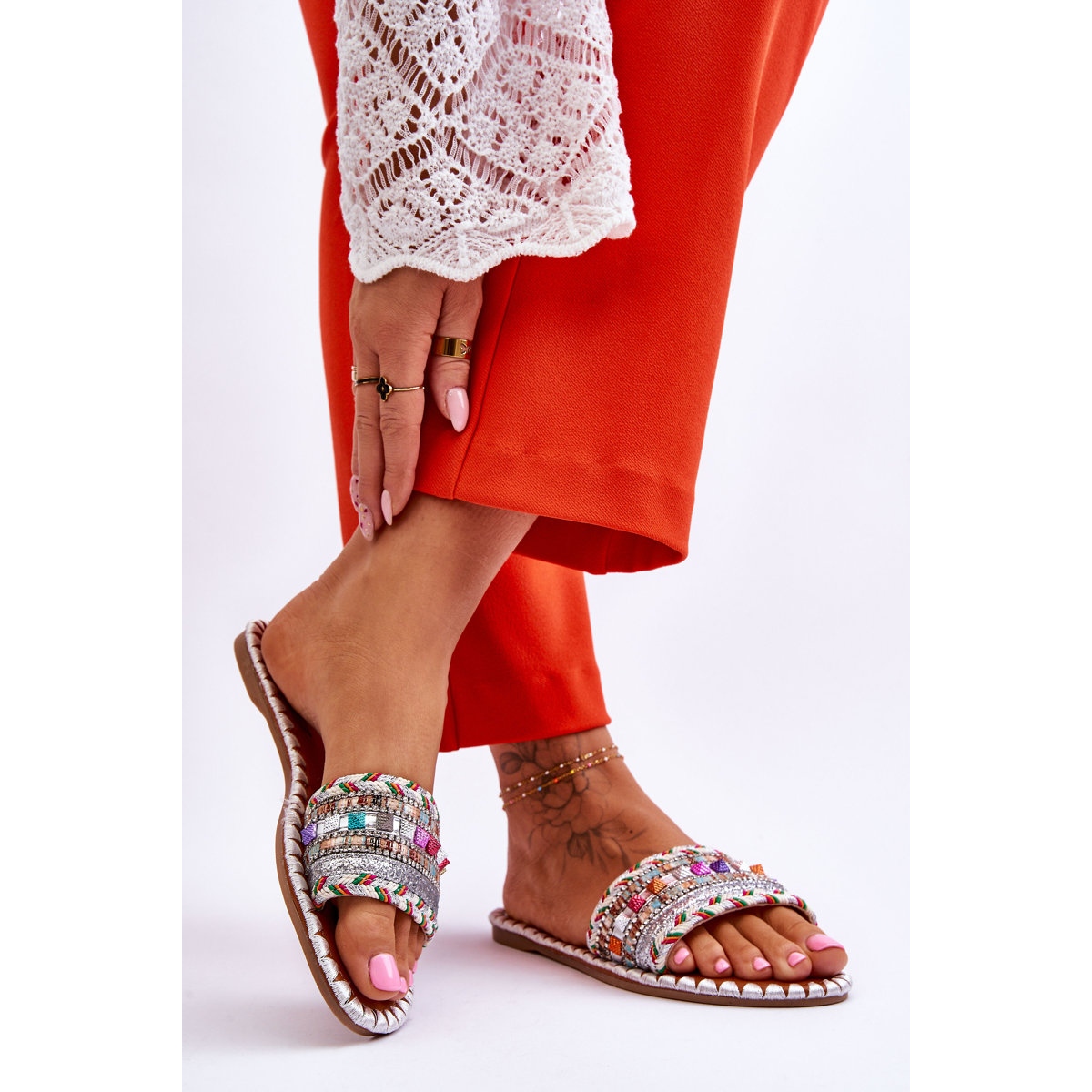 Nämä ovat tyylikkäitä ja tyylikkäitä naisten Bellisa-koristeisia varvastossuja valkoisina hopeakoristeilla, jotka täydentävät täydellisesti kesävaatekaappiasi. Nämä ainutlaatuiset varvastossut erottuvat paitsi esteettisyydestään myös huolellisesta valmistuksestaan. Jalkineiden yläosa on suunniteltu materiaalin ja korkealaatuisen muovin yhdistelmästä, mikä varmistaa kestävyyden ja käyttömukavuuden.