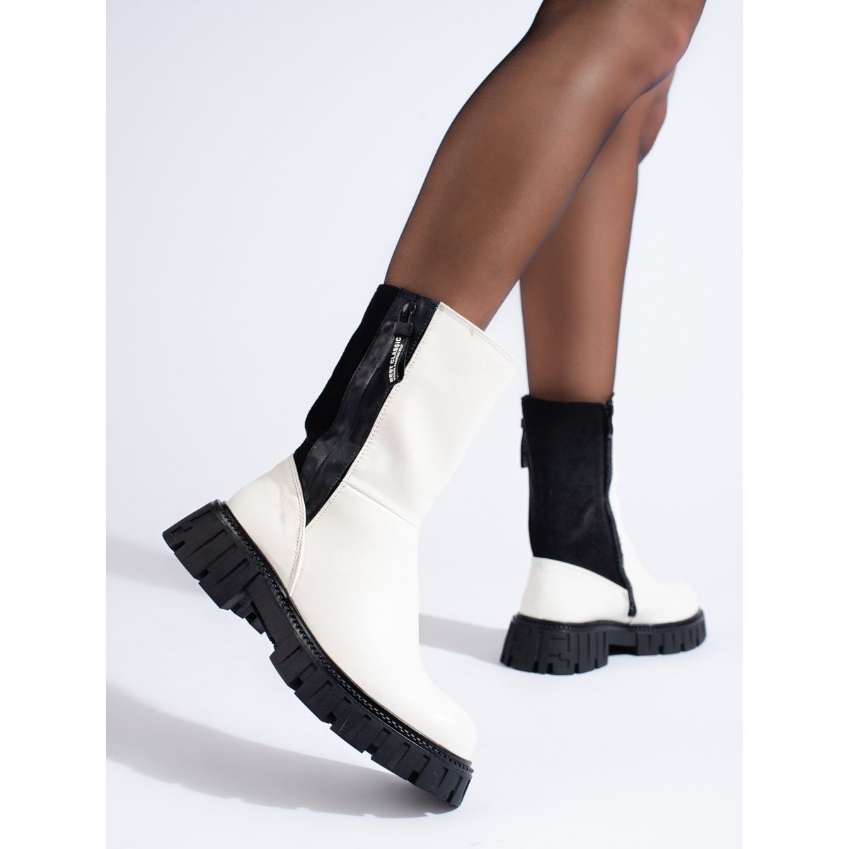 Yksityiskohdat: Naisten korkeat saappaat valkoisena ja mustana valkoinen