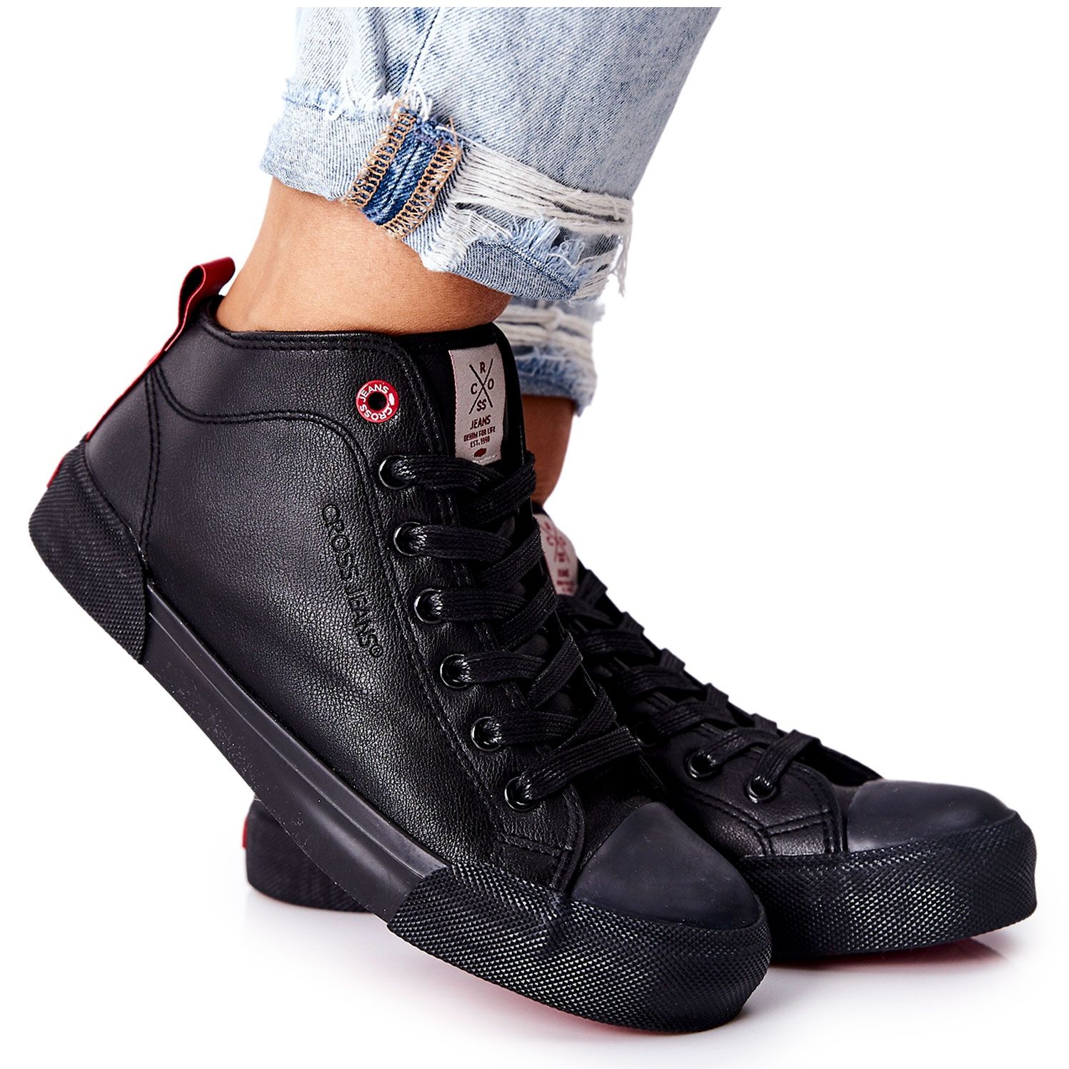 Naisten korkeat lenkkarit Cross Jeans II2R4032C - klassikko modernissa versiossa. Musta, minimalistinen muotoilu ja nilkan raju ekologisen nahan yläosa tekevät mallista täydellisesti vastaamaan jokapäiväistä, kaupunkimuotoja - kävelystä ympäri kaupunkia kokouksiin ystävien kanssa. Korkeamman yläosan ansiosta kengät toimivat myös viileämpinä päivinä.