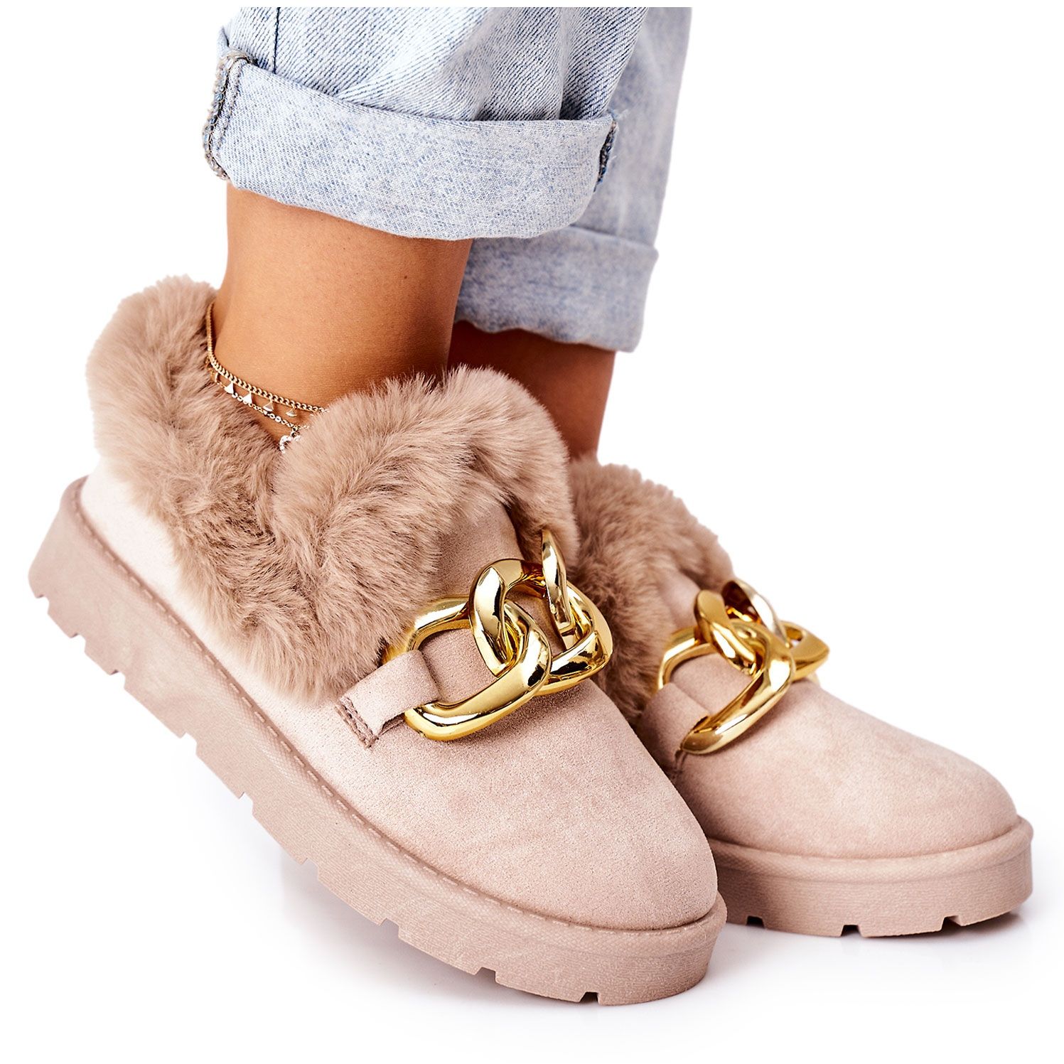 Ne on valmistettu miellyttävän tuntuisesta synteettisestä turkista, ja ne tarjoavat lämpöä ja mukavuutta, joita arvostat pitkinä talvi-iltoina. Tossuja koristava kultaketju antaa niille ainutlaatuisen luonteen ja saa sinut tuntemaan olosi tyylikkääksi, jopa kotona. Varvastossoissa on pyöreä kärki ja 3 cm korkea tasainen kantapää, mikä takaa jokapäiväisen mukavuuden.