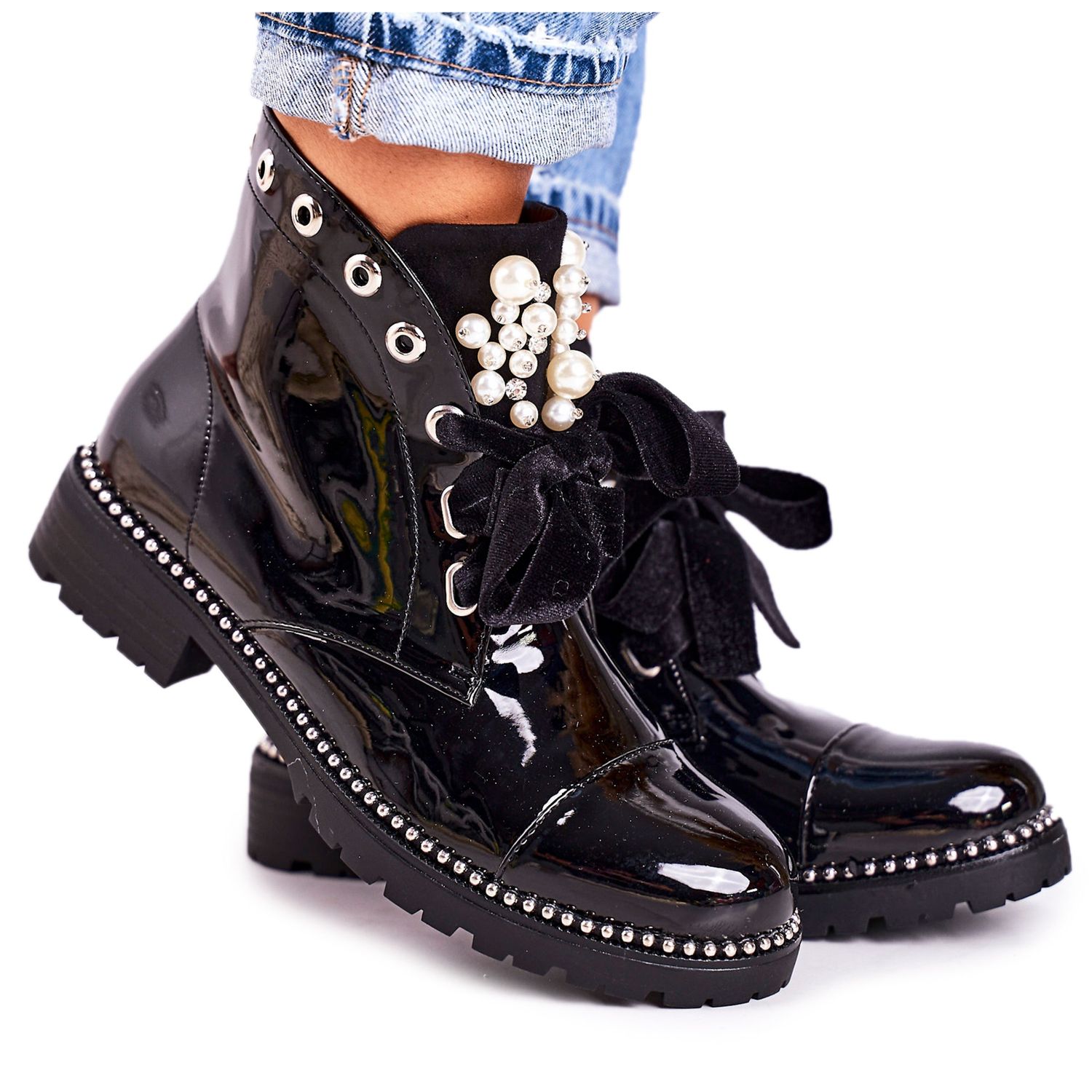 PS1 PS1 Naisten lämpimät saappaat helmillä, suuttimilla ja nauhalla, lakattu Perla musta