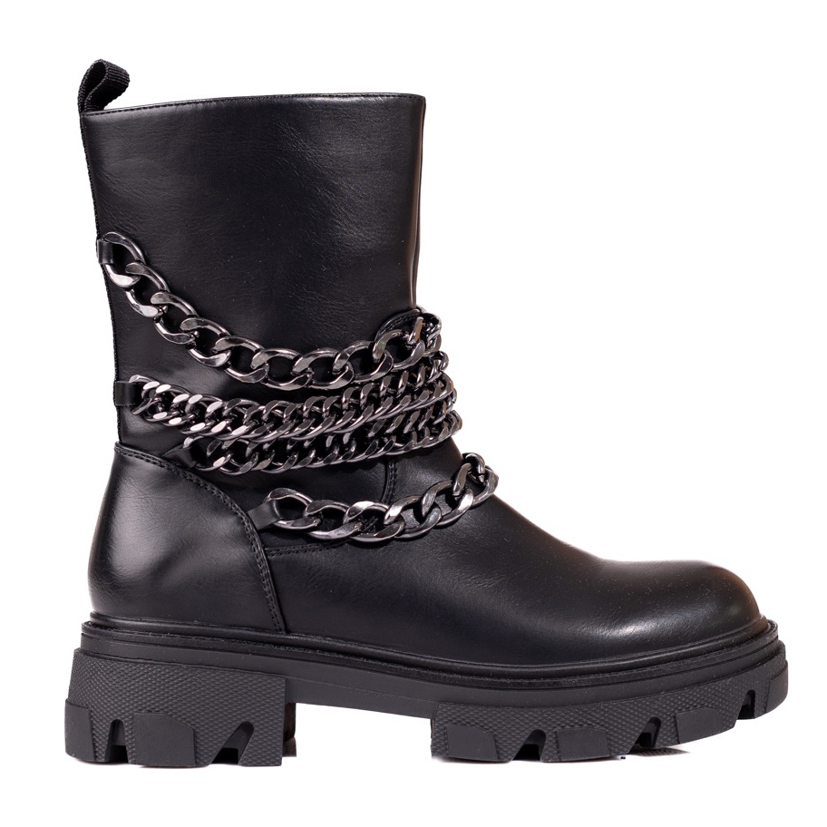 Tyylikäs, mustien naisten työntekijät koristeketjulla - täydellinen syksy/talvikaudella. Valmistettu ekologisesta nahasta, eristetty jalkineiden viltti, mukava vetoketju ja vakaa pohja kulutuspinta -alalla. Rock -hahmon yhdistelmä päivittäiseen mukavuuteen.