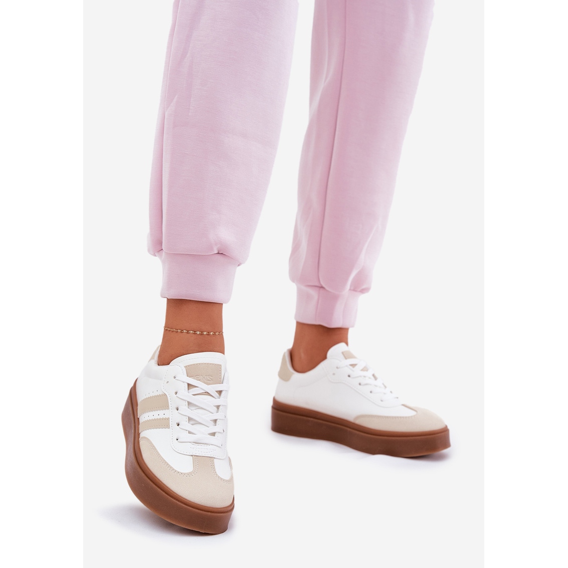Yksityiskohdat: Naisten lenkkarit laiturilla ekologisella nahkalla beige ja valkoinen