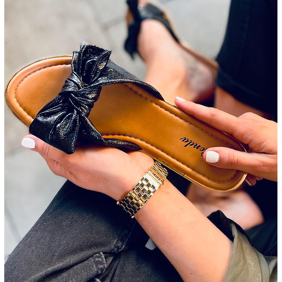 Varvastossut erottuvat metallisesta viimeistelystä, joka korostaa kauniisti lomarusketusta ja herättää huomion. Viehättävä rusetti antaa niille tyttömäisen luonteen, mikä tekee niistä täydellisen lisäyksen mihin tahansa kesävaatekaappiin. Litteän pohjan ansiosta nämä varvastossut tarjoavat mukavuutta koko päivän, ja jokaisesta askeleesta tulee ilo.