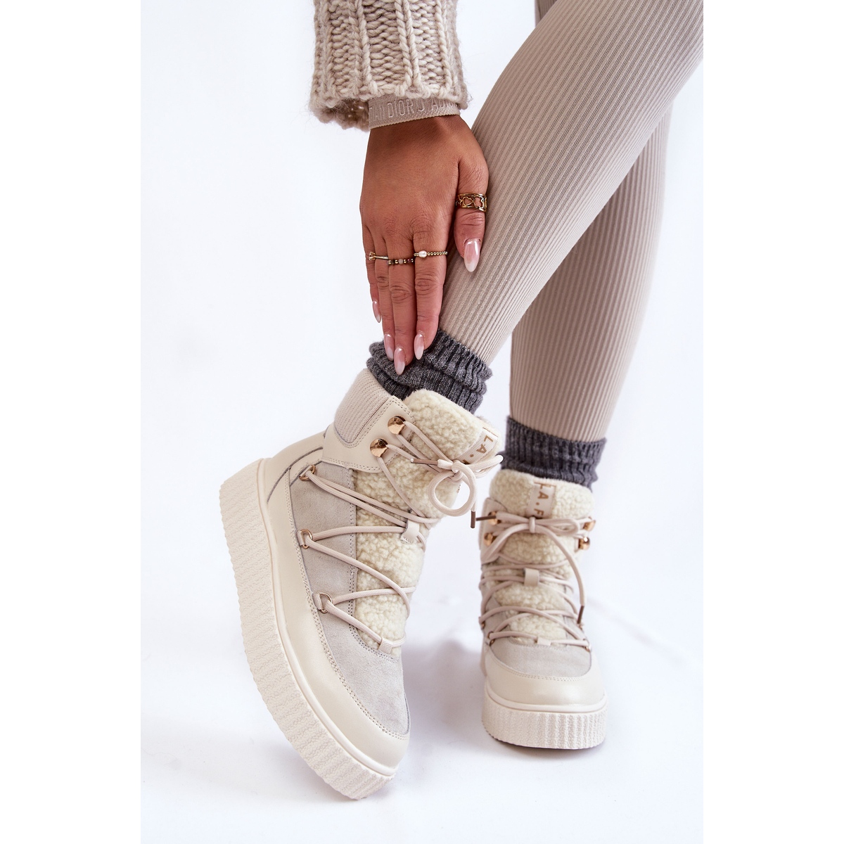 Nämä tyylikkäät nilkkurit on suunniteltu yhdistämään toimivuus ja muodikas ulkonäkö. Nämä lumikengät on valmistettu luonnollisen mokkanahkan ja korkealaatuisen ekologisen nahan yhdistelmästä, ja ne tarjoavat kestävyyttä ja samalla huolehtivat esteettisyydestä. Neutraali vaalea beige väri saa jalkineet sopivat täydellisesti useimpiin talvityyleihin.