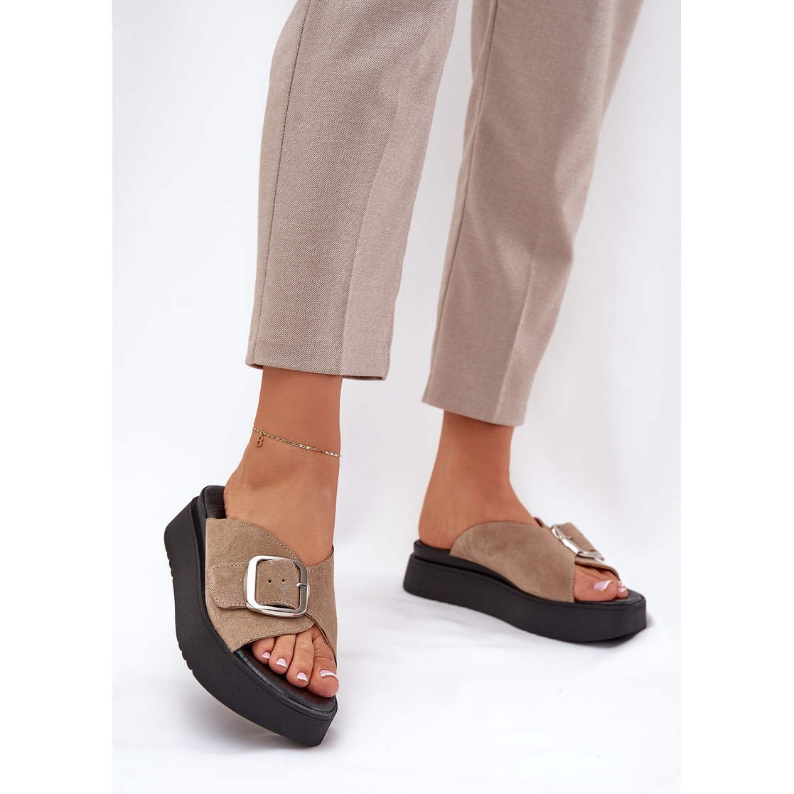Asetettu vakaalle alustalle, jonka korkeus on 3,5 cm, ne tarjoavat mukavuutta ja tukea päivittäisten kävelyretkien aikana. Suuri solki säädettävällä hihnalla antaa sinun sovittaa jalan täydellisesti, mikä tekee kääntöstä -ei vain tyylikäs, vaan myös käytännöllinen. Pehmeän, nahkaisen lisäyksen ansiosta niiden käyttäminen koko päivän on todellinen ilo.