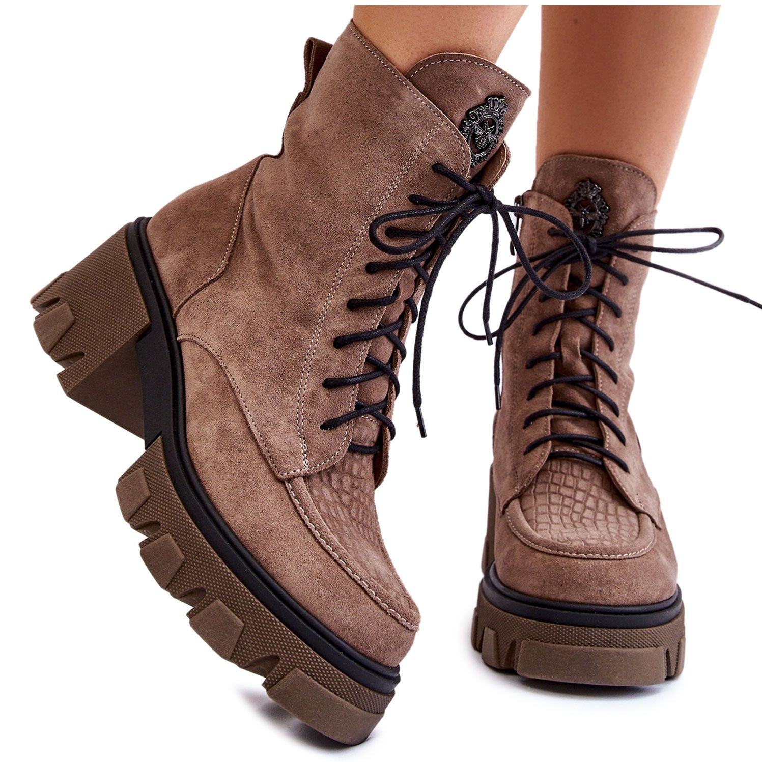 Saappaissa on klassinen nauhoitus ja käytännöllinen vetoketju päällisen sivulla, mikä helpottaa pukemista ja riisumista. Jäykistetty kantapää lisää vakautta, ja massiivinen litteä kantapää ja liukumaton pohja takaavat mukavuuden ja turvallisuuden kaikilla pinnoilla. Korotettu alusta, jonka korkeus on 3,5 cm ja kantapää, joka ulottuu 7 cm: iin, saavat saappaat muotoilemaan figuuria täydellisesti.