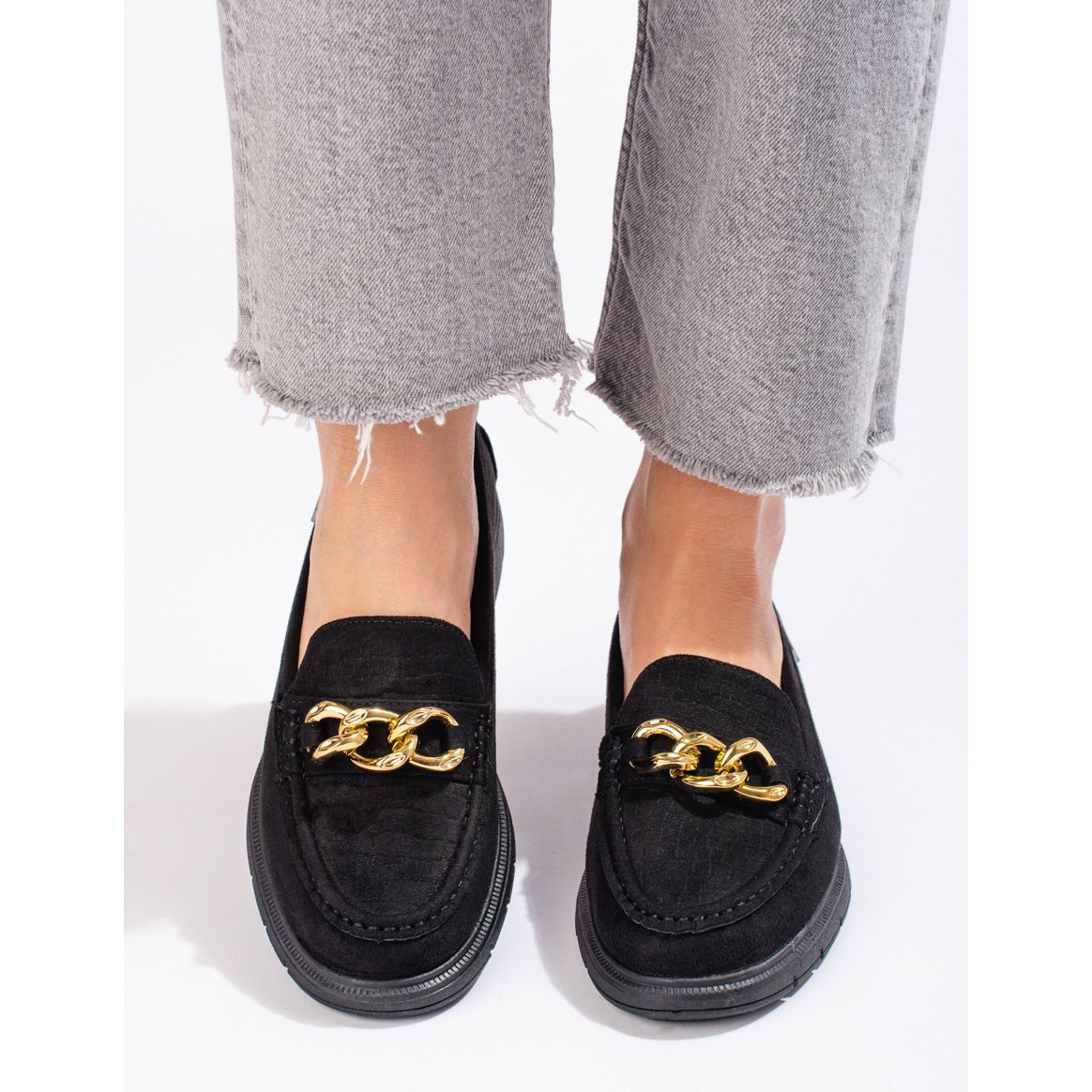 Löydä eleganssia ja mukavuutta naisten mustista mokkanahkaisista Shelovet-loafereistamme. Ne on suunniteltu moderneille naisille, jotka arvostavat sekä tyyliä että mukavuutta. Nämä ekologisesta mokkanahkasta valmistetut mokasiinit näyttävät upeilta arki- ja klassisissa tyyleissä, joten ne ovat ihanteellinen valinta jokaiseen päivään ja muodollisempiin tilaisuuksiin.