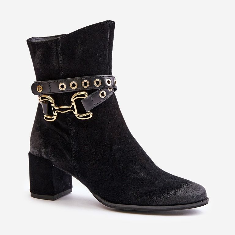 Maciejka Naisten mokkanahkaiset saappaat korkokengillä koristeellisella hihnalla Maciejka 06679-01 musta