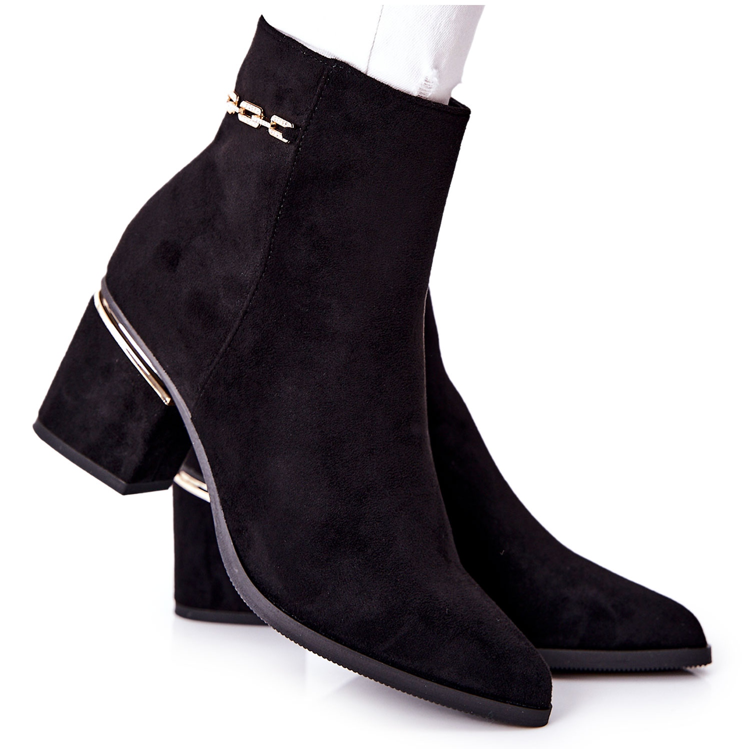 Nämä korkealaatuisesta ekologisesta mokkanahkasta valmistetut saappaat erottuvat paitsi modernista muotoilustaan mantelikärkestä, myös kultaisesta korista kantapäässä, joka antaa niille ainutlaatuisen luonteen. Sivussa olevan käytännöllisen vetoketjun ansiosta kenkien pukeminen käy nopeasti ja vaivattomasti.