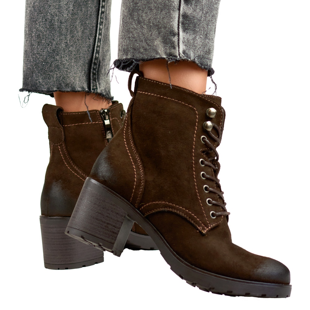 Tyylikkät mokkanahkaisten naisten saappaat - tyyli ja mukavuus viileämpinä päivinä. Ruskea väri ja klassinen, pyöreä nenä saavat kengät sopeutumaan täydellisesti sekä jokapäiväiseen että tyylikkääseen tyyliä. Nilkan yläosan korkeus (noin 13 cm) ja 6 cm: n korkea posti lisää hienovarainen eleganssi siluettiin luopumatta mukavuudesta.