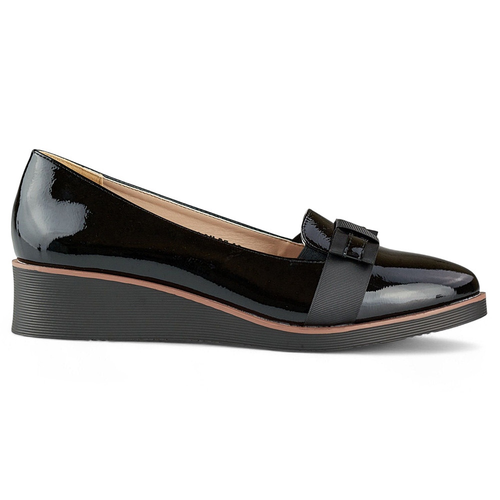 Korkealaatuisesta ekologisesta nahasta valmistettu näille lakattuille kengille on ominaista pyöreä nenä ja hienovarainen jousi, mikä antaa heille tyyliä. Lisätyn muodon sulkeminen tekee niiden asettamisesta erittäin helppoa ja kätevää. 4 cm: n korkea kiila varmistaa vakauden ja riittävän korkeuden kuvion korostamiseksi samalla kun takaa mukavuuden päivän kuluessa.