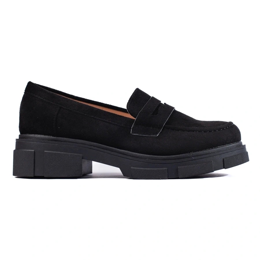 Tyylikkät ja mukavat mustat kengät, jotka on valmistettu ekologisesta mokkanahasta. Klassinen, rento leikkaus leivänpaikoista, joissa on täysi, pyöreä nenä, rakennettu -UP ja pehmeä kiinnitys ja mukava ekologinen nahka. Täydellinen päivittäin - työhön, kävelylle ja kaupunkien tyyliin.