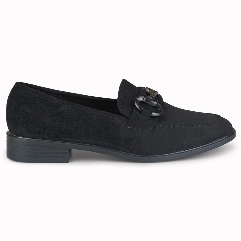 Musta mokkanahkaisten naisten kengät - klassikko, jolla on muodikas aksentti