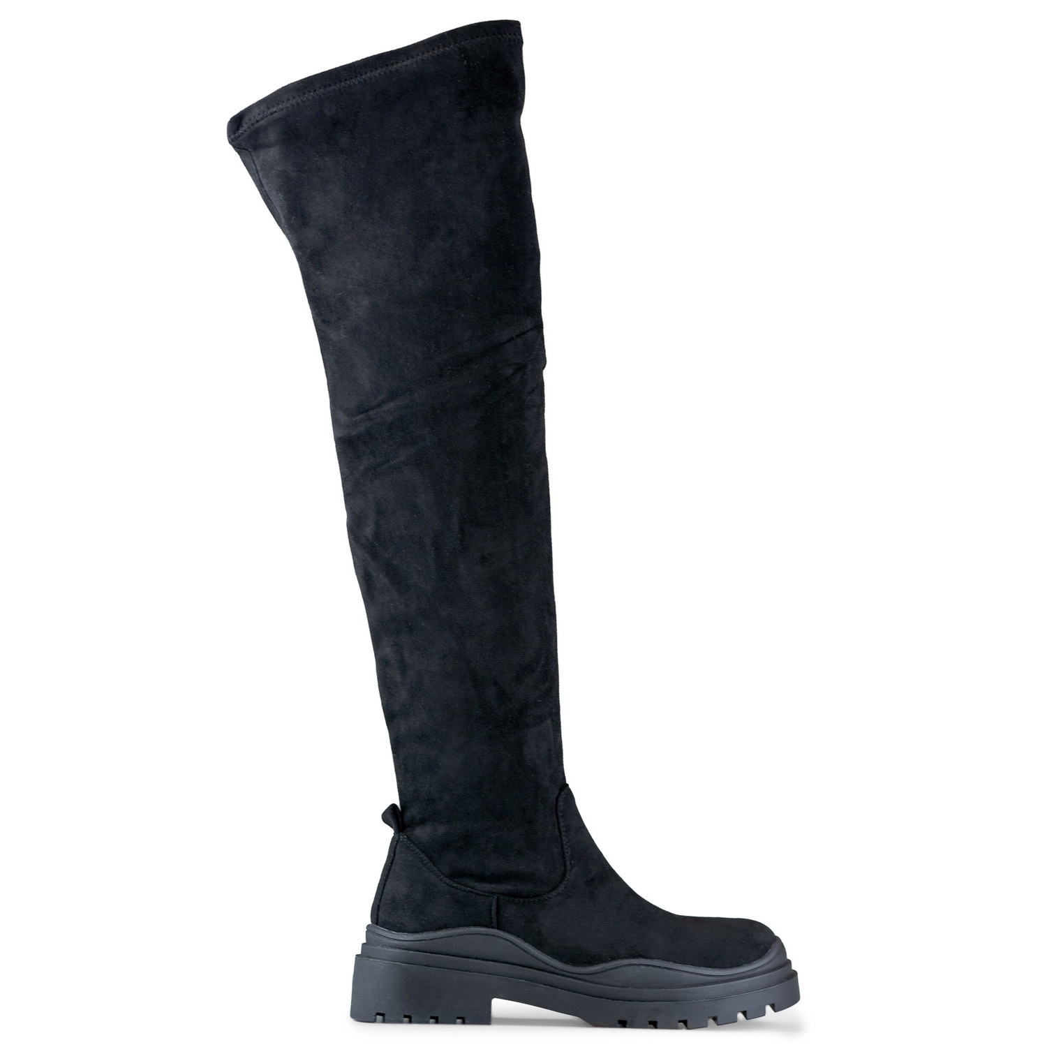 Yksityiskohdat: Naisten mustat mokkanahkaiset polven yli ulottuvat saappaat