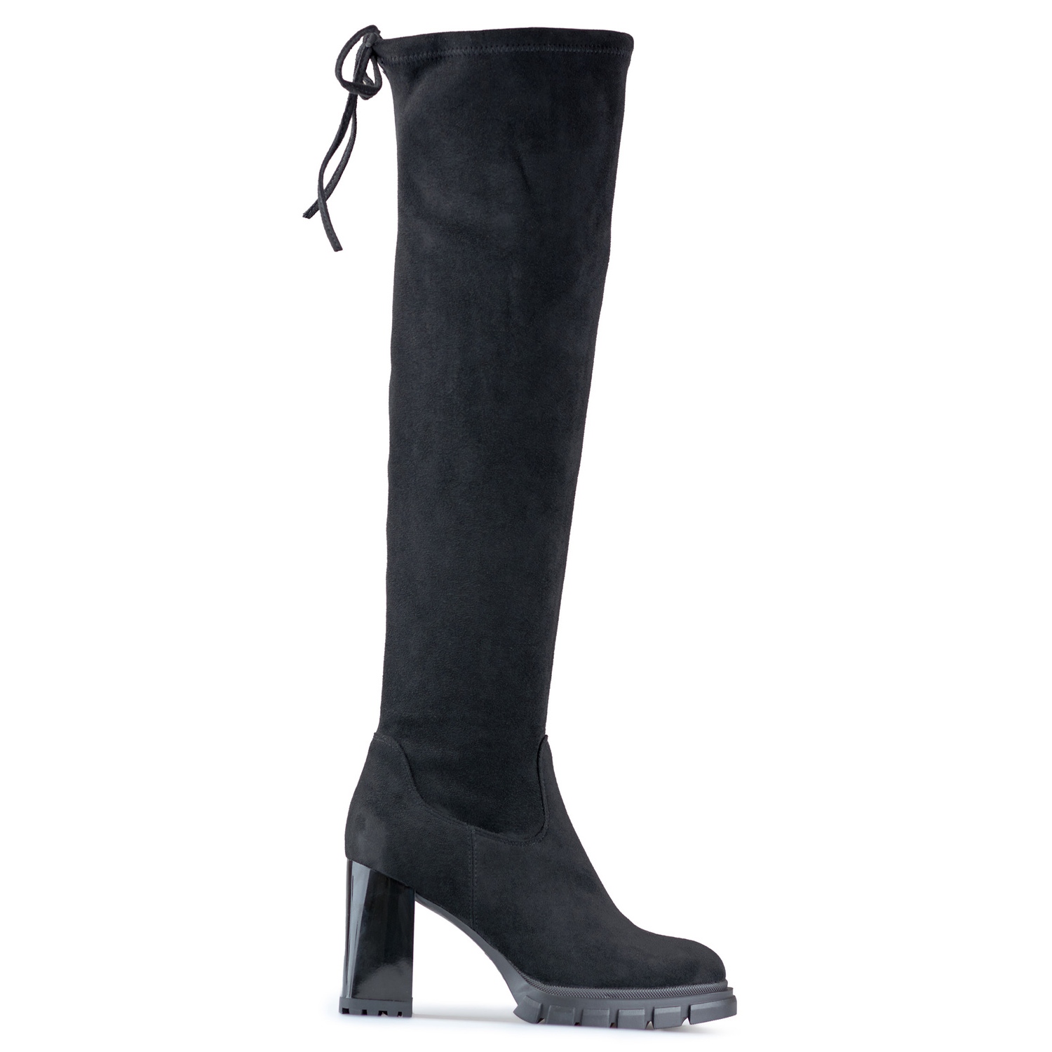 Yksityiskohdat: Naisten mustat mokkanahkaiset polven yli ulottuvat saappaat, joissa korkea kantapää
