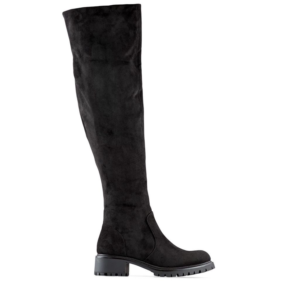 Yksityiskohdat: Naisten mustat mokkanahkaiset polven yli ulottuvat saappaat tasaisella pohjalla