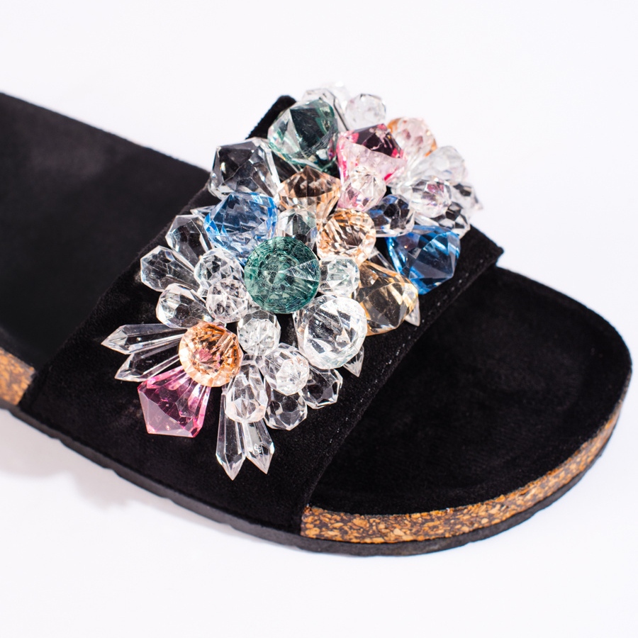 Kulutuspinnan muovinen pohja takaa vakauden ja tarttuvuuden, joka on ihanteellinen kävelylle ympäri kaupunkia tai rentoutumista puutarhassa. Lisäetu on hienovarainen yksityiskohta strassien muodossa, mikä antaa läpistä ainutlaatuisen hahmon.