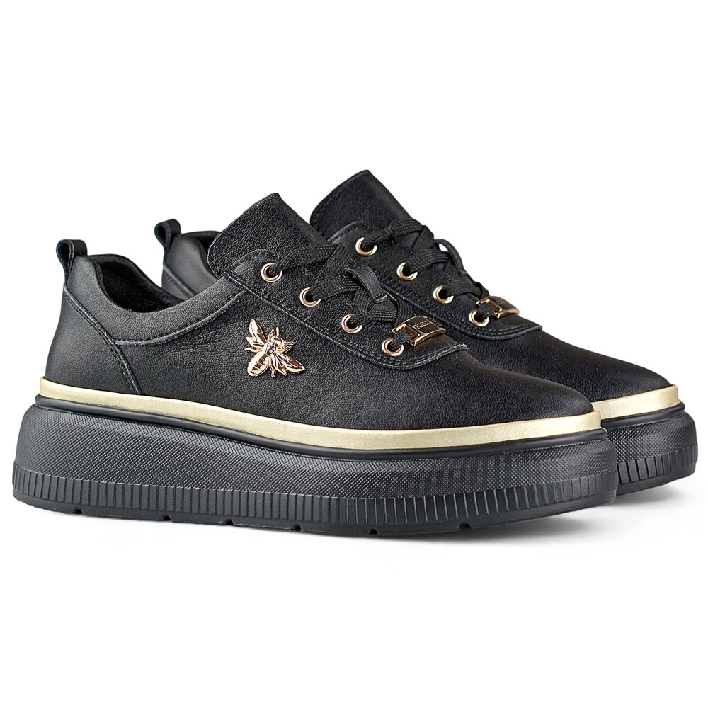 Yksityiskohdat: Naisten mustat nahkaiset tennarit kullanvärisillä asusteilla
