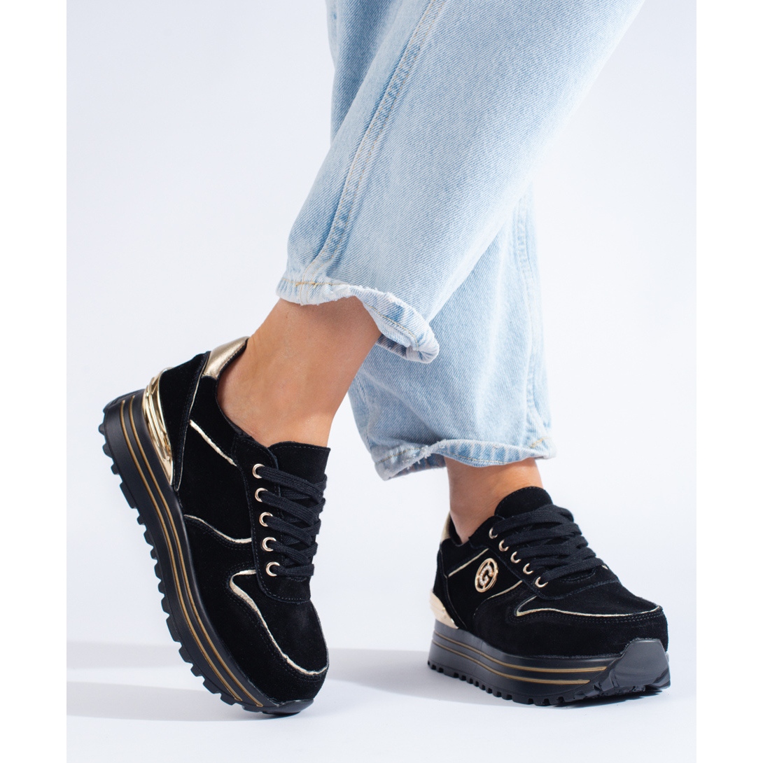 Tyylikkät ja mukavat naisten lenkkarit, toinen tuotemerkki, yhdistämällä urheiluhahmo muodikkaan kiiltoon. Musta, kumipohja, jossa on kulutuspinta, jonka korkeus 4 cm: n alustalla varmistaa vakauden ja pienen nostovaikutuksen, ja zirkonista ja metallisista aksentteista koristeet antavat kengille ainutlaatuisen luonteen. Täydellinen joka päivä - rento- ja muotityyliä varten.