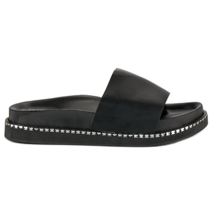 Lavan korkeus 3 cm lisää ripauksen eleganssia mukavuudesta tinkimättä. Tämän tyyppiset jalkineet ovat täydellinen valinta kesälenkille, rantamatkoille tai jokapäiväiseen juoksuun. Universaalisten väriensä ansiosta mustat Bestelle-liukumäet voidaan yhdistää helposti mihin tahansa vaatekaappiin.