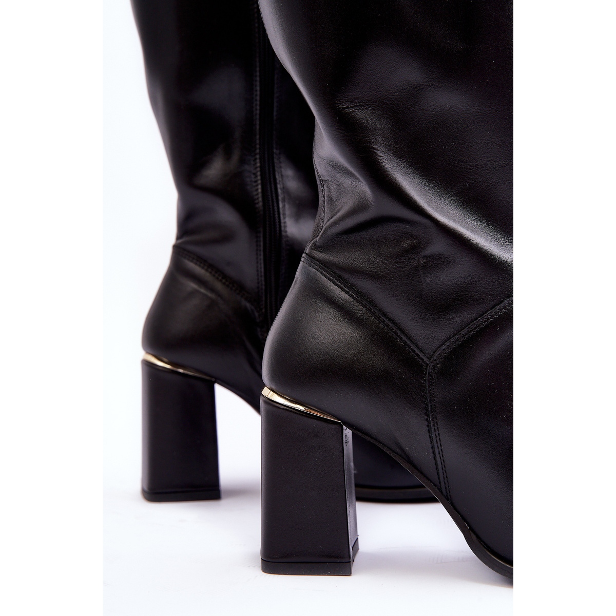 Tyylikkät, klassiset polvisuojat, jotka on valmistettu korkealaatuisesta luonnonahasta matta, syvä musta väri. Malli asetettiin vakaalle baarikorkolle koristeellisella, peilielementillä - hienovarainen yksityiskohta, joka lisää merkkiä. Spitzin nenät optisesti ohuttavat hahmoa, ja jäykistetty kantapää varmistaa paremman istuvuuden ja mukavuuden.
