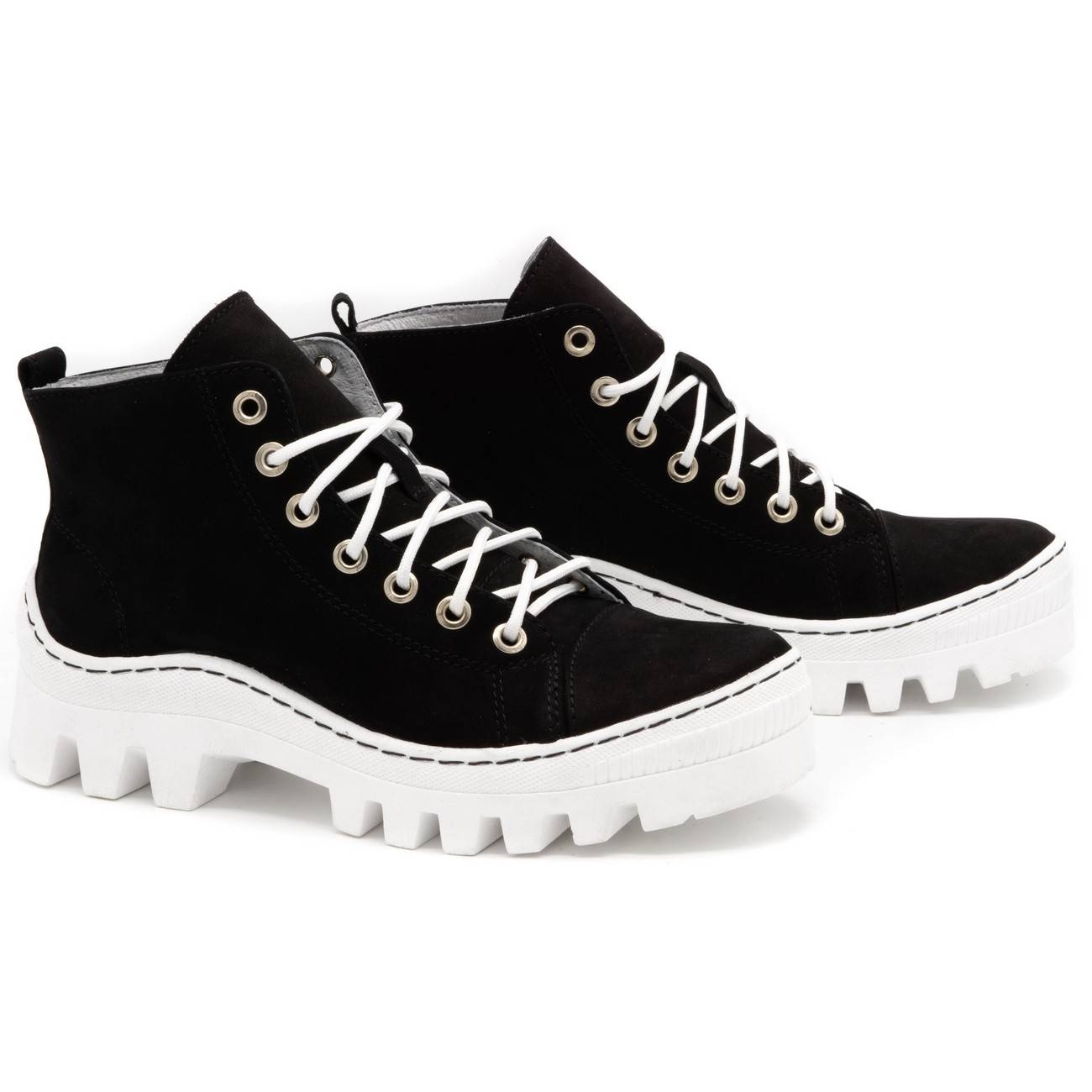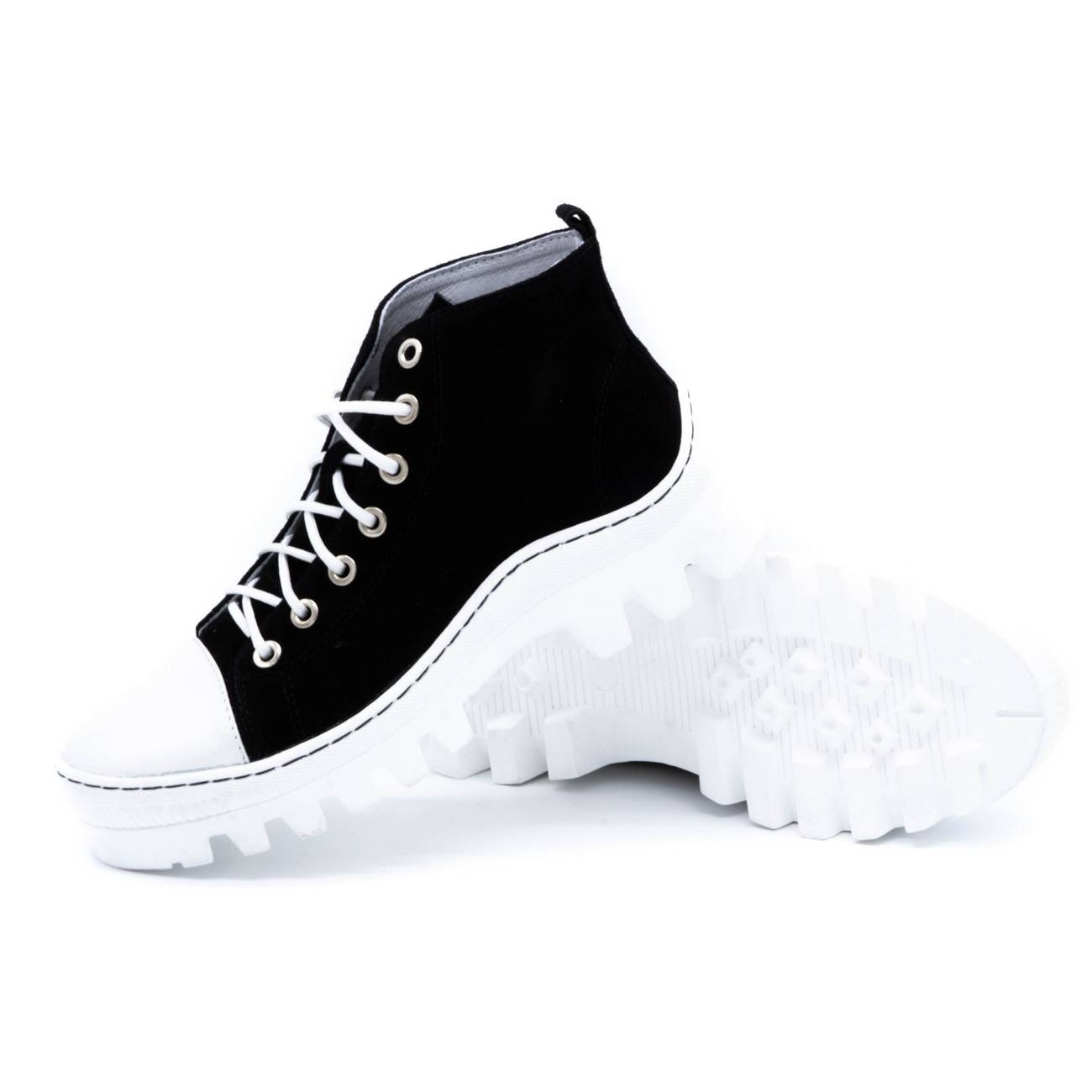 Valmistettu korkealaatuisesta luonnollisesta mokkanahasta mustalla "mustalla (mustalla helmillä)" varjossa, vastakkaisella valkoisella pohjalla. Sisustus ja insertti myös luonnon nahasta, mikä varmistaa jalan mukavuuden ja hyvää hengittävyyttä. Vakaa alusta, jonka korkeus on 4 cm ja korkea ylempi ulottuva nilkan edessä (9 cm) takaavat mukavuuden pidempien kävelyretkien aikana ja lisää hienovarainen korkeus. Saappaissa on pyöreä nenä ja klassinen nauhoitus, jonka ansiosta voit helposti sovittaa ne jalkaan. Ei eristystä - täydellinen väliaikaisia ja viileämpiä päiviä ilman pakkasia.