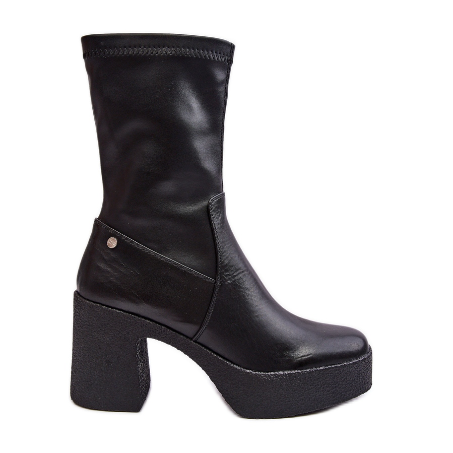 Nämä saappaat on valmistettu yhdistelmästä korkealaatuista luonnollista ja ekologista nahkaa, ja niille on ominaista vankka rakenne ja klassinen ulkonäkö. Paksu pohja ja tangon muotoinen kantapää (8,5 cm korkea) takaavat vakauden ja käyttömukavuuden koko päivän. Lisäksi kengän sisällä olevan kenkäpeiton eristys pitää jalat lämpiminä myös kylmimpinä päivinä.