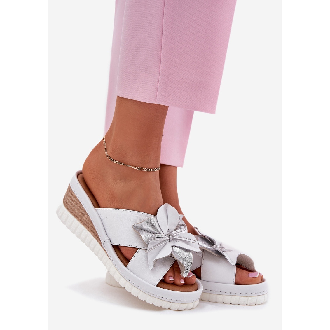 Korkealaatuisimmasta luonnon nahasta valmistettu nämä kääntölehdet tarjoavat paitsi kestävyyden, myös nautinnon käyttää. Asetettu 7 cm: n korkealle kiilalle, ne lisäävät keveyttä ja korostavat hienovaraisesti kuvaa. Edessä on alkuperäinen koristeellinen kukka, joka antaa kengille ainutlaatuisen hahmon ja tekee niistä täydellisen korostuksen päivittäisiin asuihin.