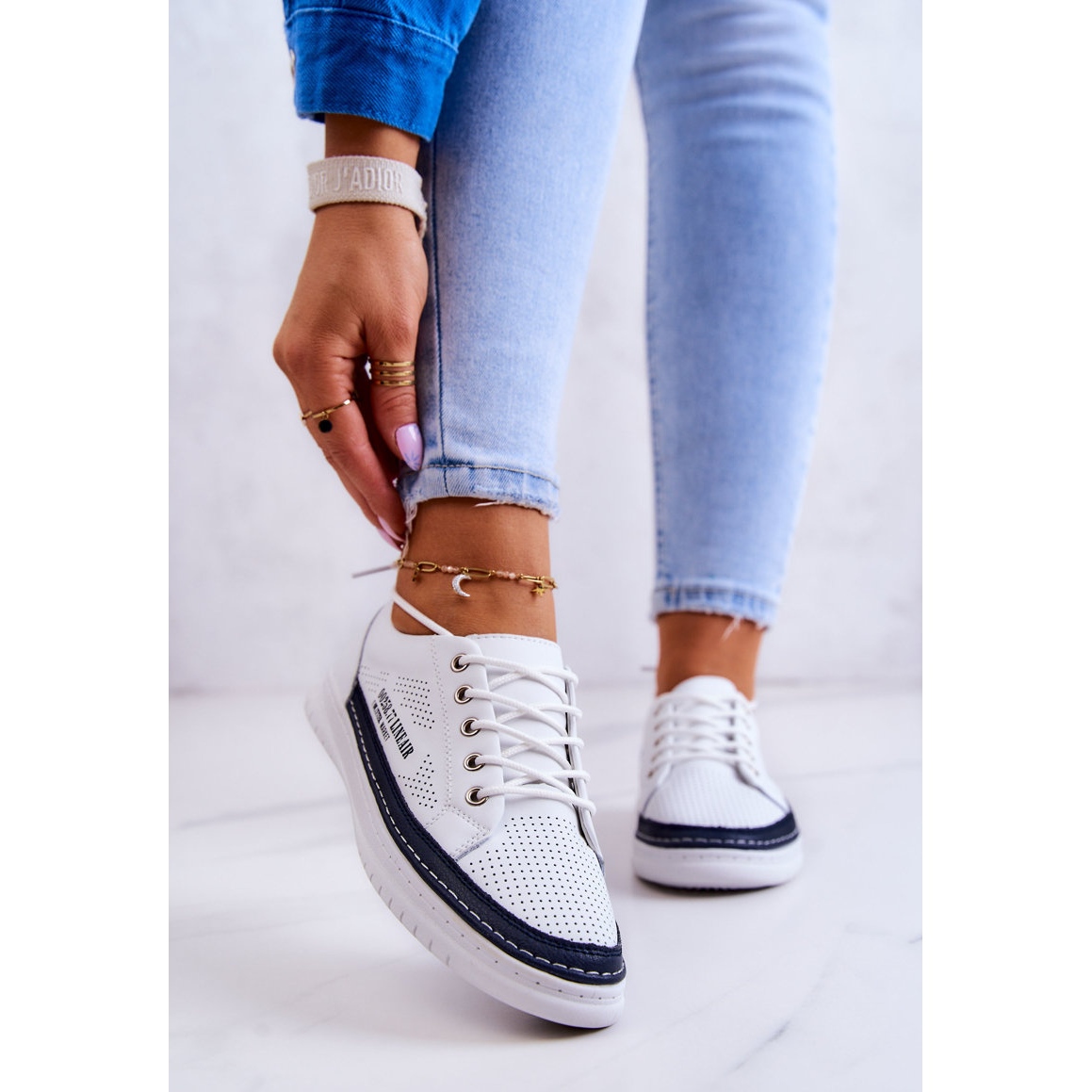 Klassiset matalat leikatut lenkkarit ovat välttämättömiä joka kesä ja kevään vaatekaappi. Pehmeästä, luonnollisesta nahasta valmistettu malli, jolla on avoin perforointi, tarjoaa erinomaisen ilmanvaihdon ja mukavuuden käyttää koko päivän. Nahka -insertin ansiosta kengät ovat miellyttäviä jalkoihin, ja kevyt, synteettinen pohja takaa hyvän tyynyn ja kestävyyden. Pyöreän kengännauhan lukitus mahdollistaa täydellisen istuvuuden, ja ajattomat valkoiset ja laivastonsininen muotoilu sopii täydellisesti farkut, shortsit tai mekot.