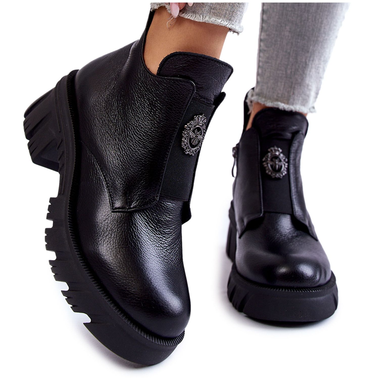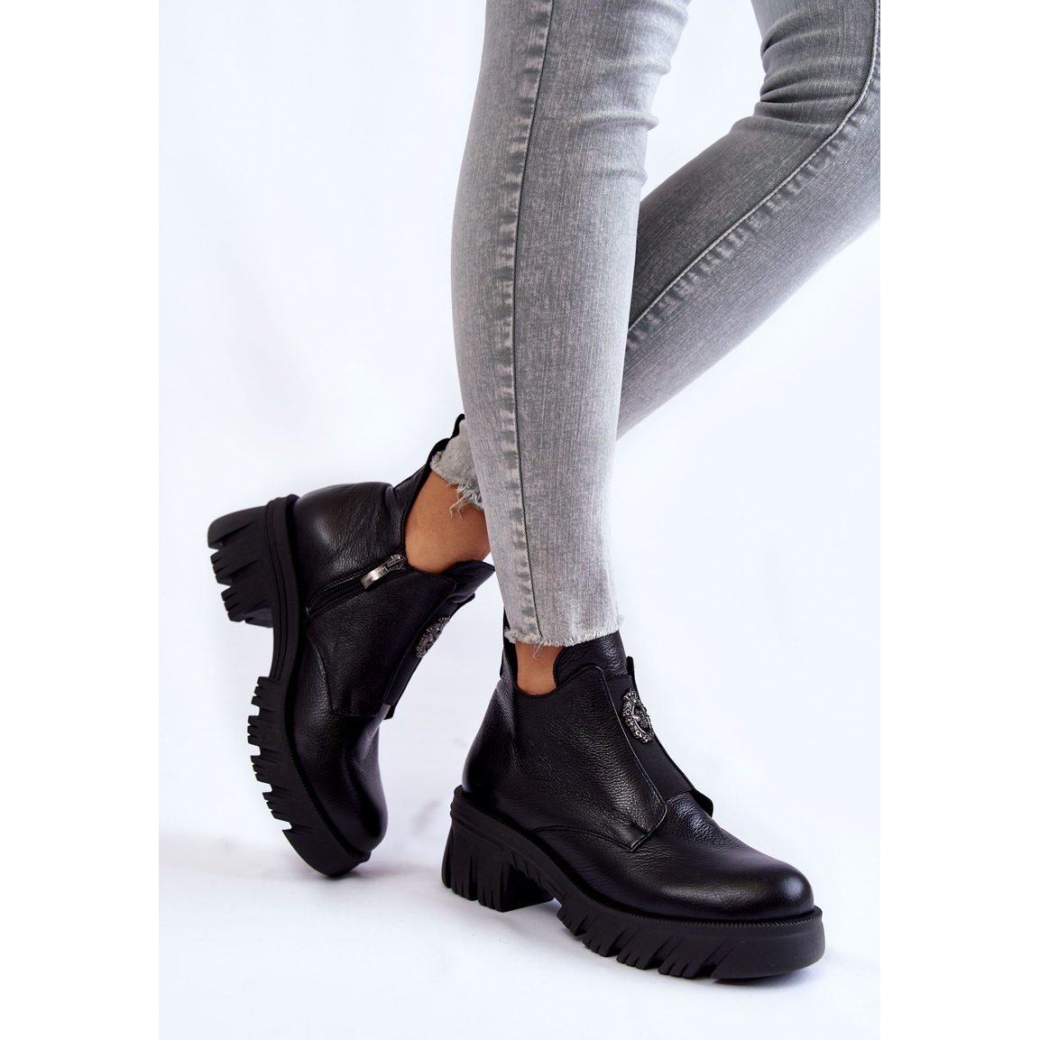 Nämä ainutlaatuiset saappaat on koristeltu hienovaraisella koristeella edessä ja jäykistetyllä kantapäällä, joka lisää luonnetta ja varmistaa käyttömukavuuden. Massiivisen kantapään ja uritetun alustan ansiosta ne tarjoavat vakautta ja mukavuutta kävellessä. Tämä malli on kiinnitetty vetoketjulla, mikä helpottaa pukemista ja riisumista.