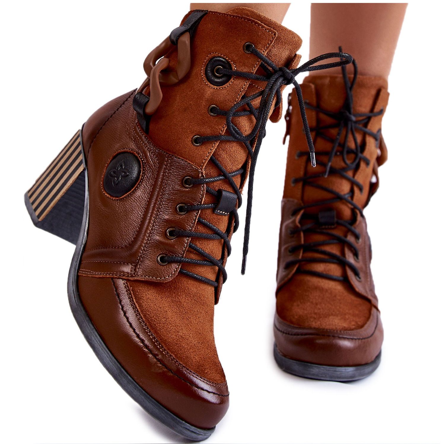 Tämä malli erottuu klassisista nauhoituksista ja käytännöllisestä vetoketjusta, mikä helpottaa kenkien pukemista ja riisumista. Lisäksi saappaat on koristeltu viehättävällä ketjulla ja Maciejka-tuotemerkin logolla, mikä antaa niille modernin ja muodikkaan luonteen.