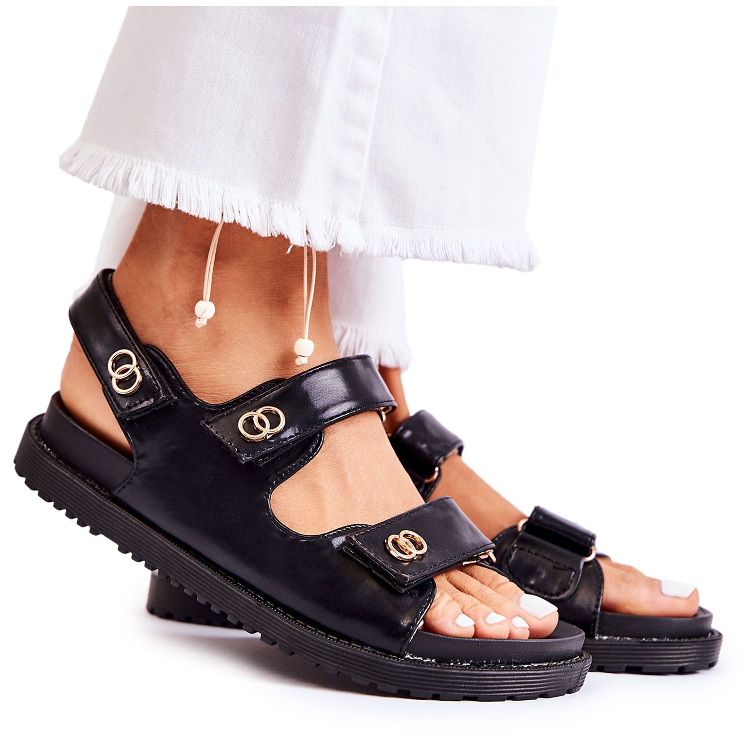 Malli on varustettu kolmella tarranauhalla kiinnitetyllä hihnalla, mikä mahdollistaa helpon ja nopean säädön. Lisäetuna ovat hienovaraiset koristeet etuhihnoissa, jotka antavat sandaaleille ainutlaatuisen luonteen. Ekonahasta valmistettu pohjallinen on profiloitu, mikä takaa mukavuuden pitkäaikaisessa käytössä. Sandaalit, joissa on litteä pohja, 2 cm korkea, antavat vakautta, mikä tekee niistä täydelliset jokapäiväisille kävelyille tai matkoille kaupungin ulkopuolella.