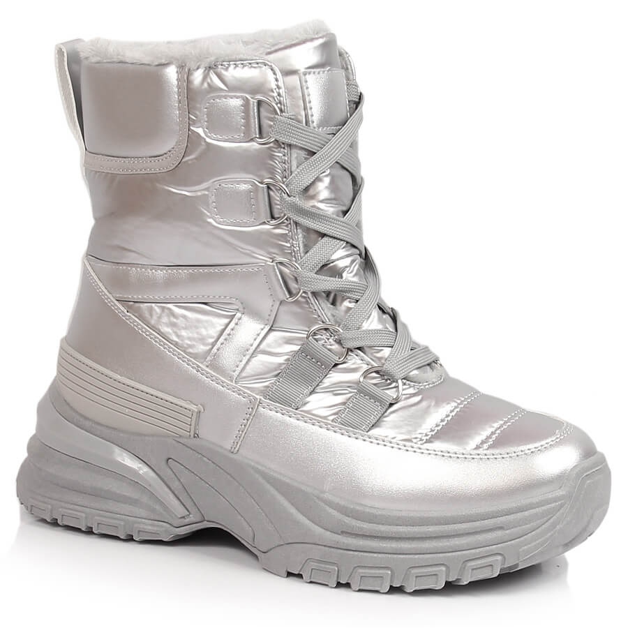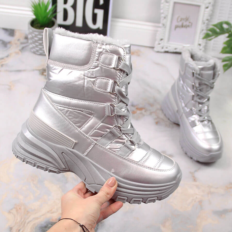 Löydä ainutlaatuiset naisten nauhalliset lumisaappaat, metallinhopeaa, tunnetulta Potocki-brändiltä! Nämä ainutlaatuiset kengät tarjoavat sinulle mukavuuden lisäksi myös tyyliä, jotka sopivat täydellisesti talvimaisemiin. Valmistettu korkealaatuisesta ekologisesta nahasta, ne näyttävät ilmiömäisiltä metallisen hopeanvärisen viimeistelynsä ansiosta, joka lisää kiiltoa talvimuotoihisi.